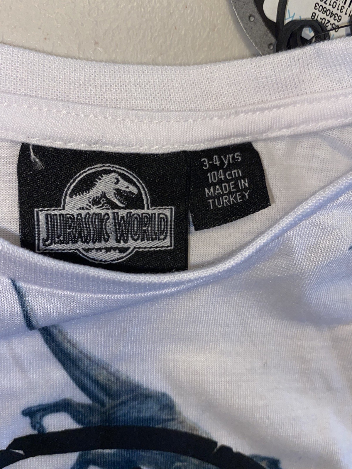 как выглядит Jurassic World short sleeve shirt kid size 3-4 dinosaurs white фото