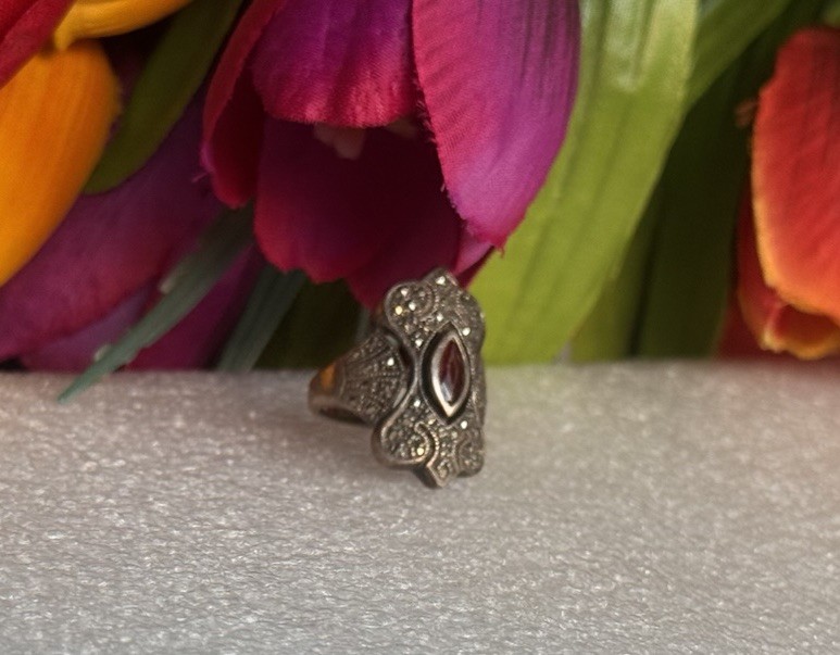 Vintage 925 Sterling Silver Carnelian Marcasite Ring Sz 5.25