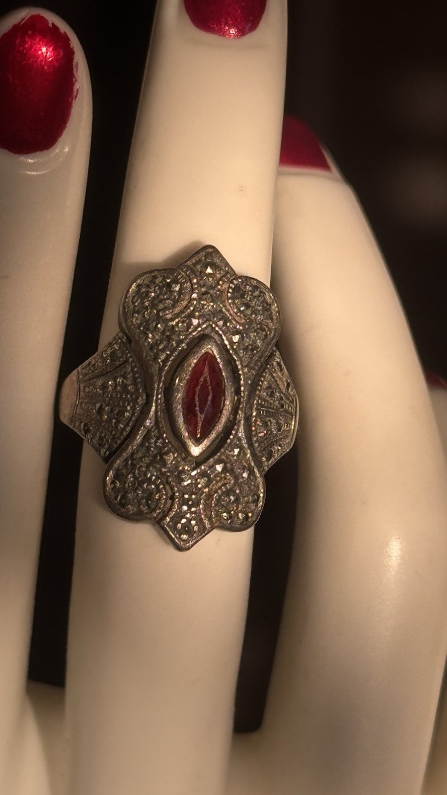 как выглядит Vintage 925 Sterling Silver Carnelian Marcasite Ring Sz 5.25 фото