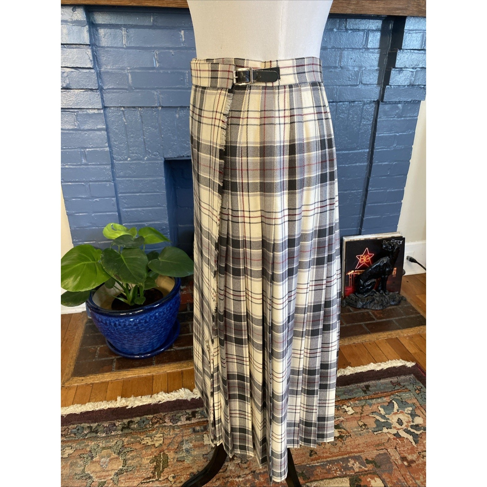 Vintage S/M Brendella Wool Tartan Kilt Skirt White Plaid Ireland Wrap Buckle 28