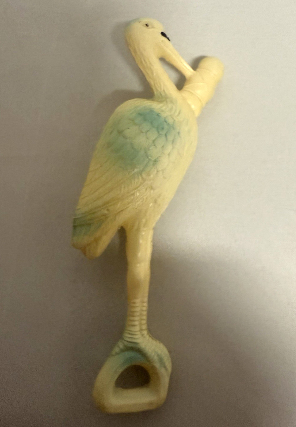 Antique Celluloid Baby Rattle Child's Toy Stork with Baby Vintage Cream and Blue
