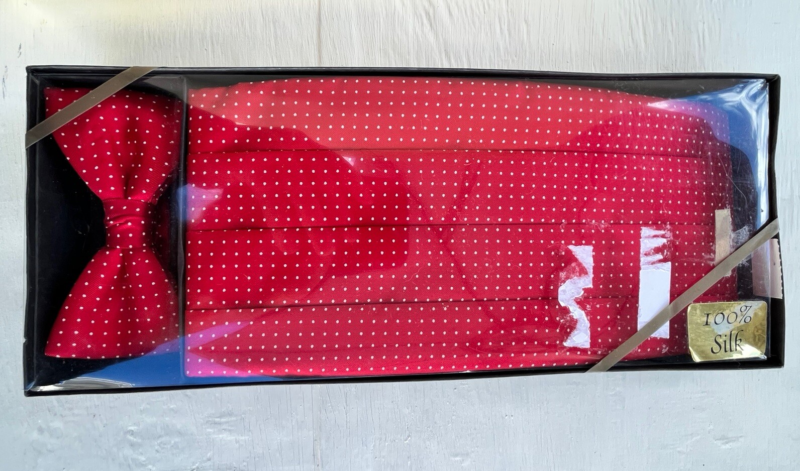 VTG All Silk Bow Tie and Cummerbund Set Red with White Dot Todays Man New in Box