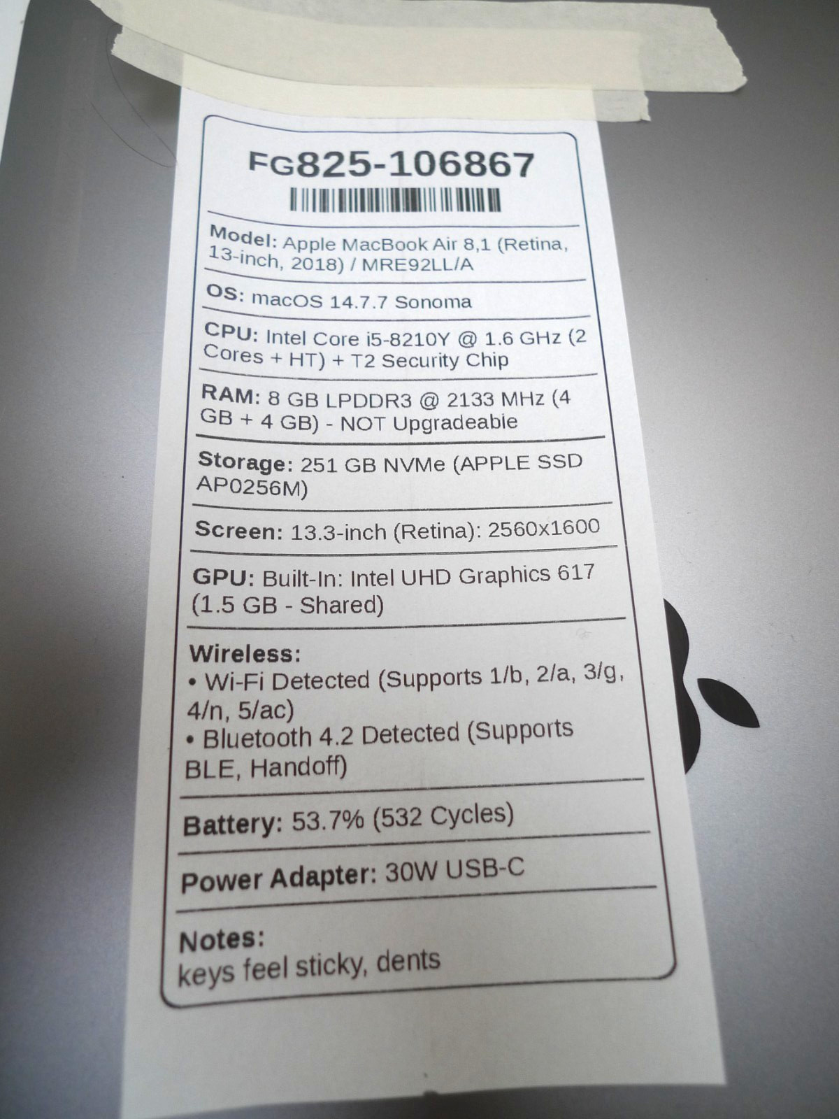 MacBook Air 13 2018 i5-8210Y 8GB RAM 256GB NVMe 532 Cycles READ