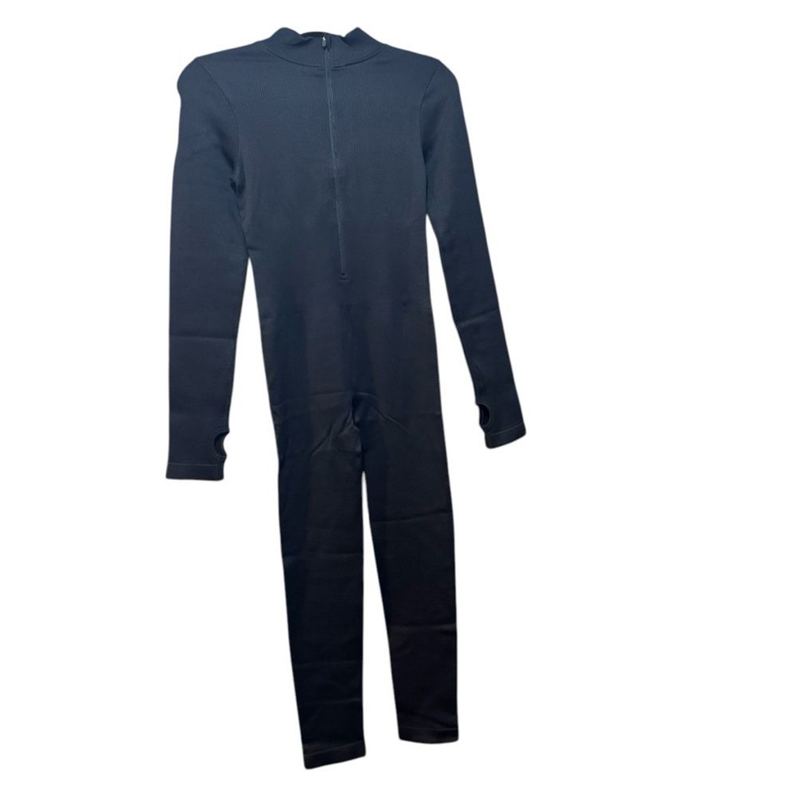 New black jumpsuit workout ribbed stretchy long sleeve zippered front one piece