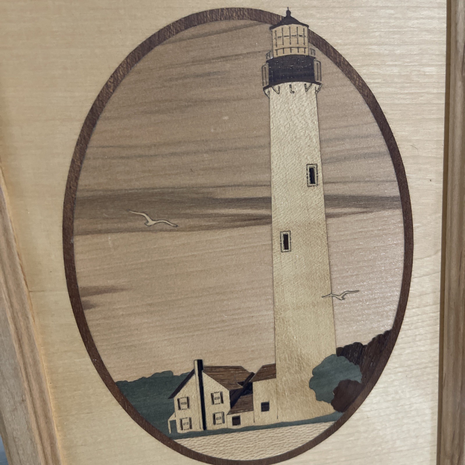 Hudson River Wood Inlay Marquetry Framed Lighthouse Scene By Nelson I0 x7