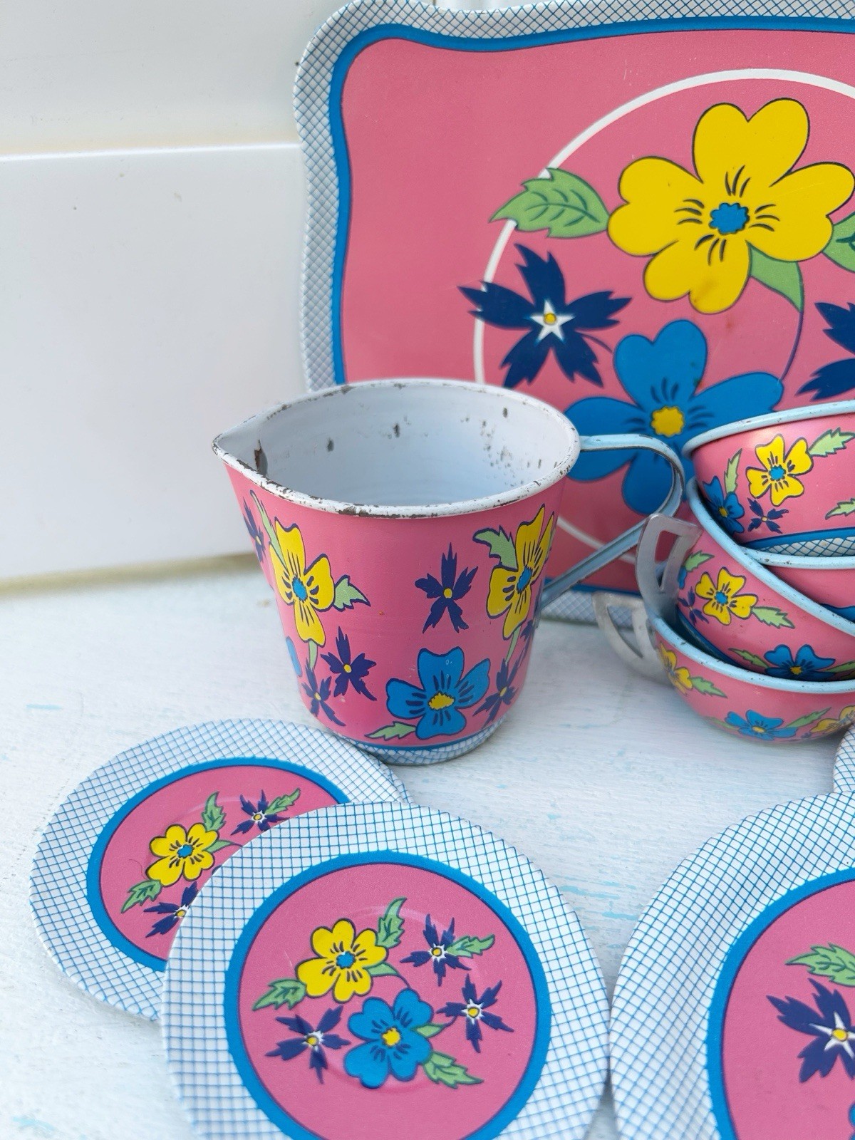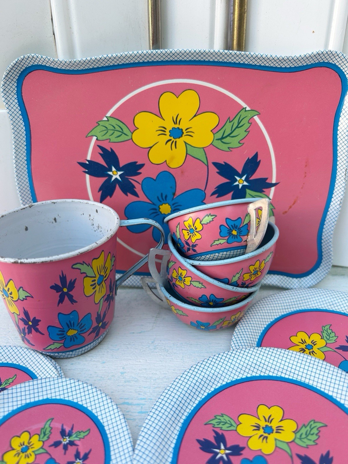 Vintage Ohio Art Tin Litho Tea Set Flowers Floral Pink Blue Toy Plate Cup Tray
