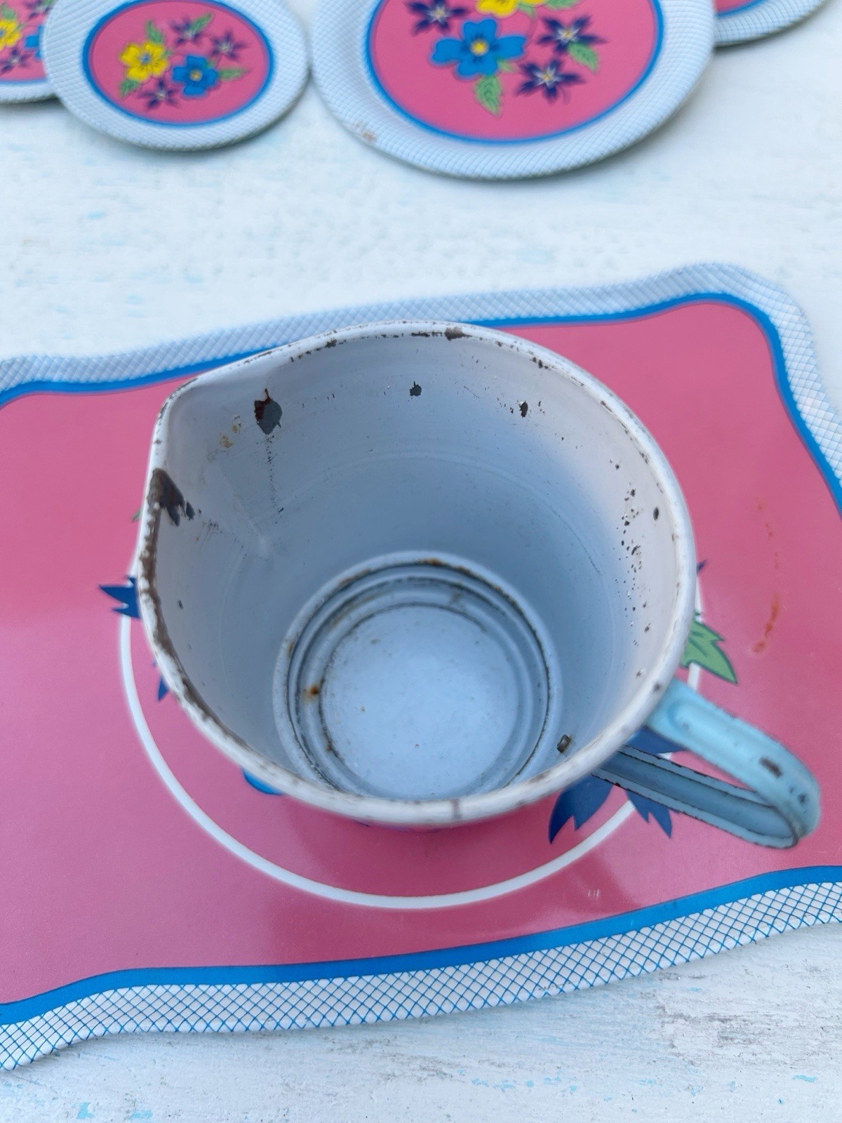 как выглядит Vintage Ohio Art Tin Litho Tea Set Flowers Floral Pink Blue Toy Plate Cup Tray фото