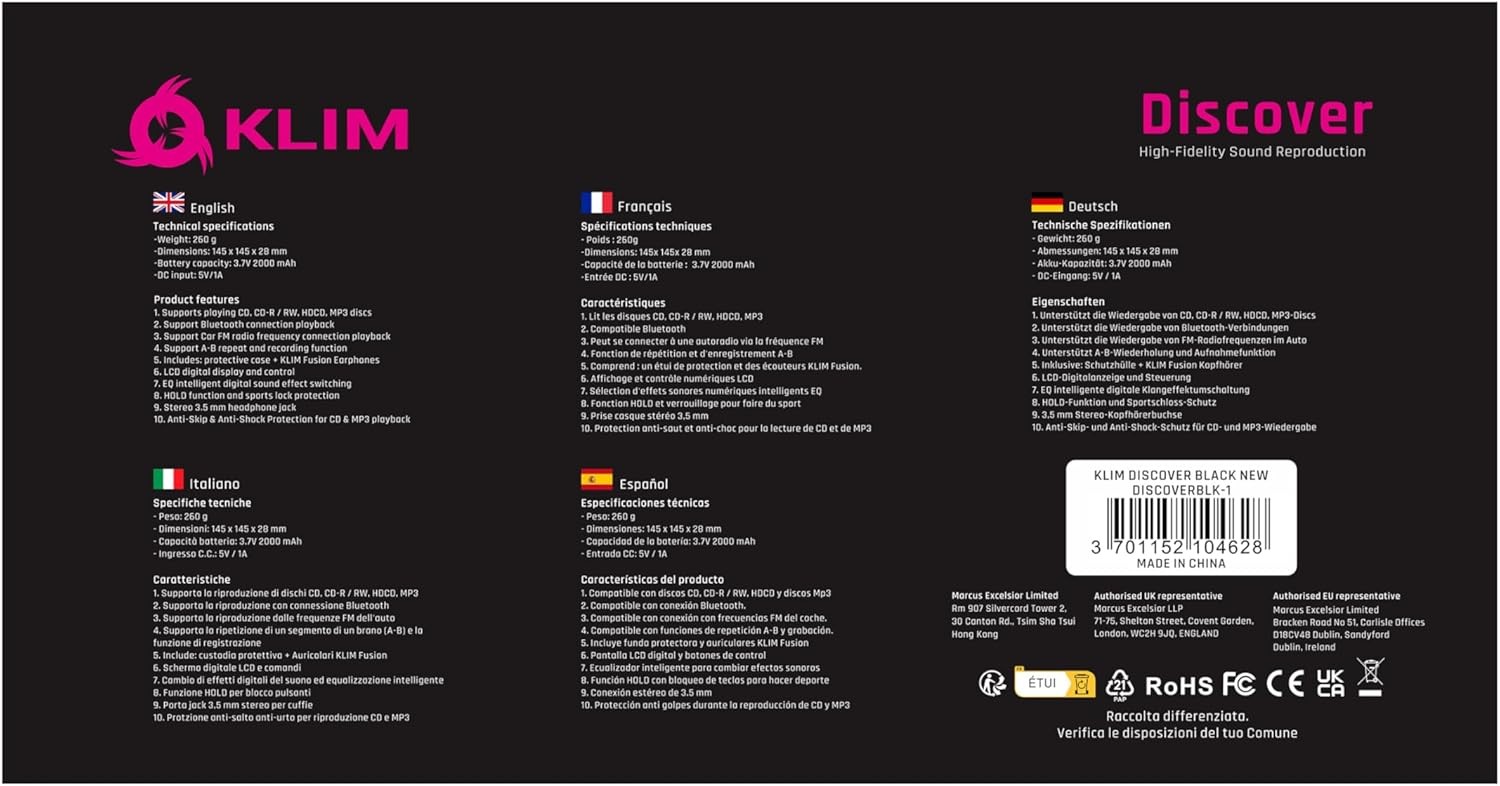 KLIM Discover - Portable CD Player with Long-Lasting Battery - New - Black