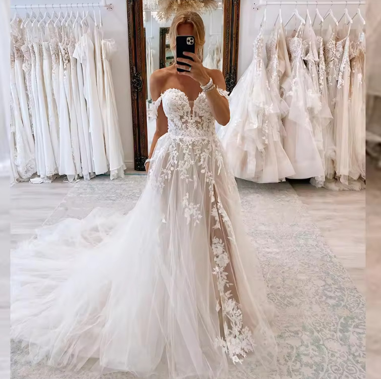 Elegant Off the Shoulder Appliques Tulle Wedding Dress Illusion Side Split