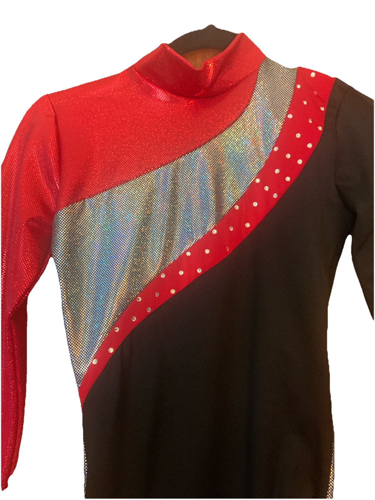 The Line Up Black Hologram Silver Red Rhinestone Long Sleeve Dance Leotard AS