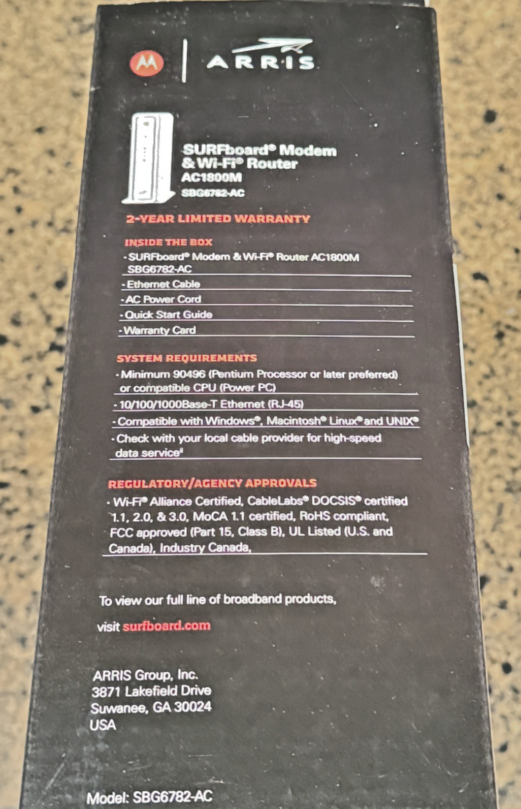 Motorola Arris SURFboard SBG6782-AC Cable Modem Wi-Fi AC Router 4 ports Ethernet