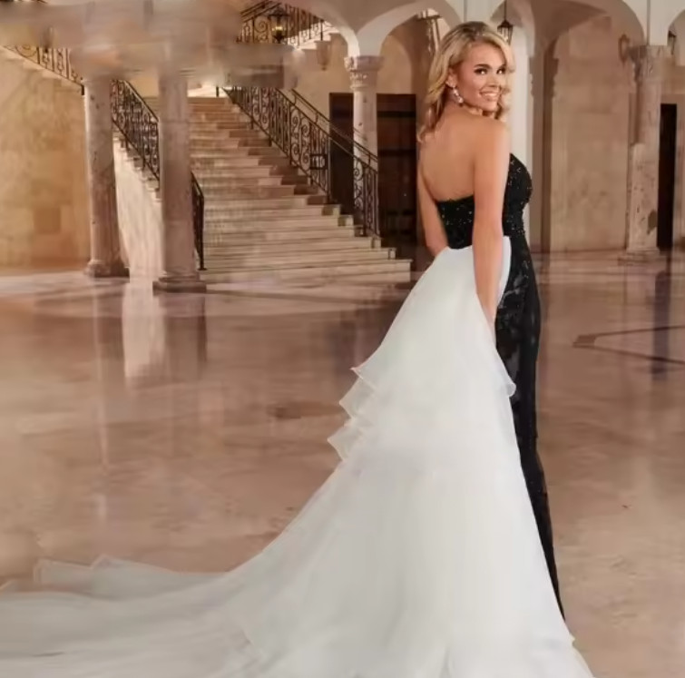 как выглядит Black And White Gothic Wedding Dress Strapless Lace Mermaid Bridal Gown фото