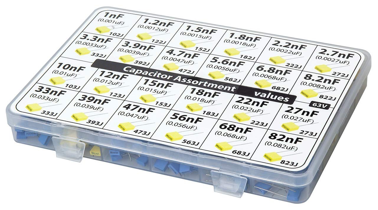 как выглядит nF Values Polyester Box Capacitor Kit Assortment 350 pcs 24 Values 63V 1nF 82nF фото
