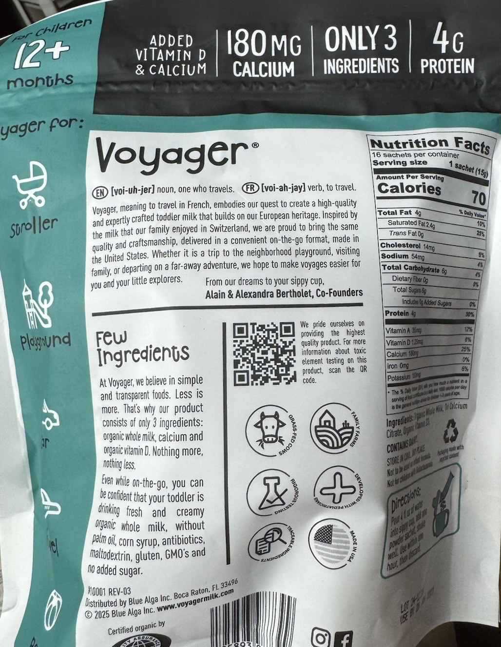Voyager Toddler Milk On The Go, USDA Organic Shelf Stable Whole Milk Powder, ...