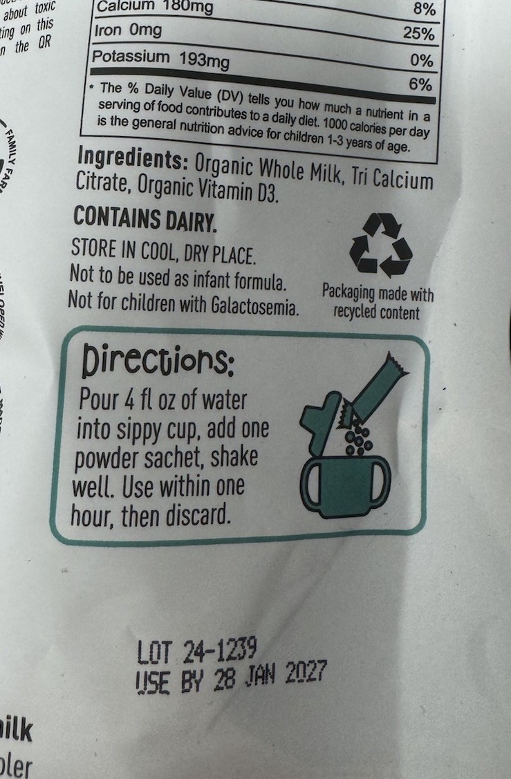 Ingredients: Organic Whole Milk, Tri Calcium Citrate, Organic Vitamin D3.