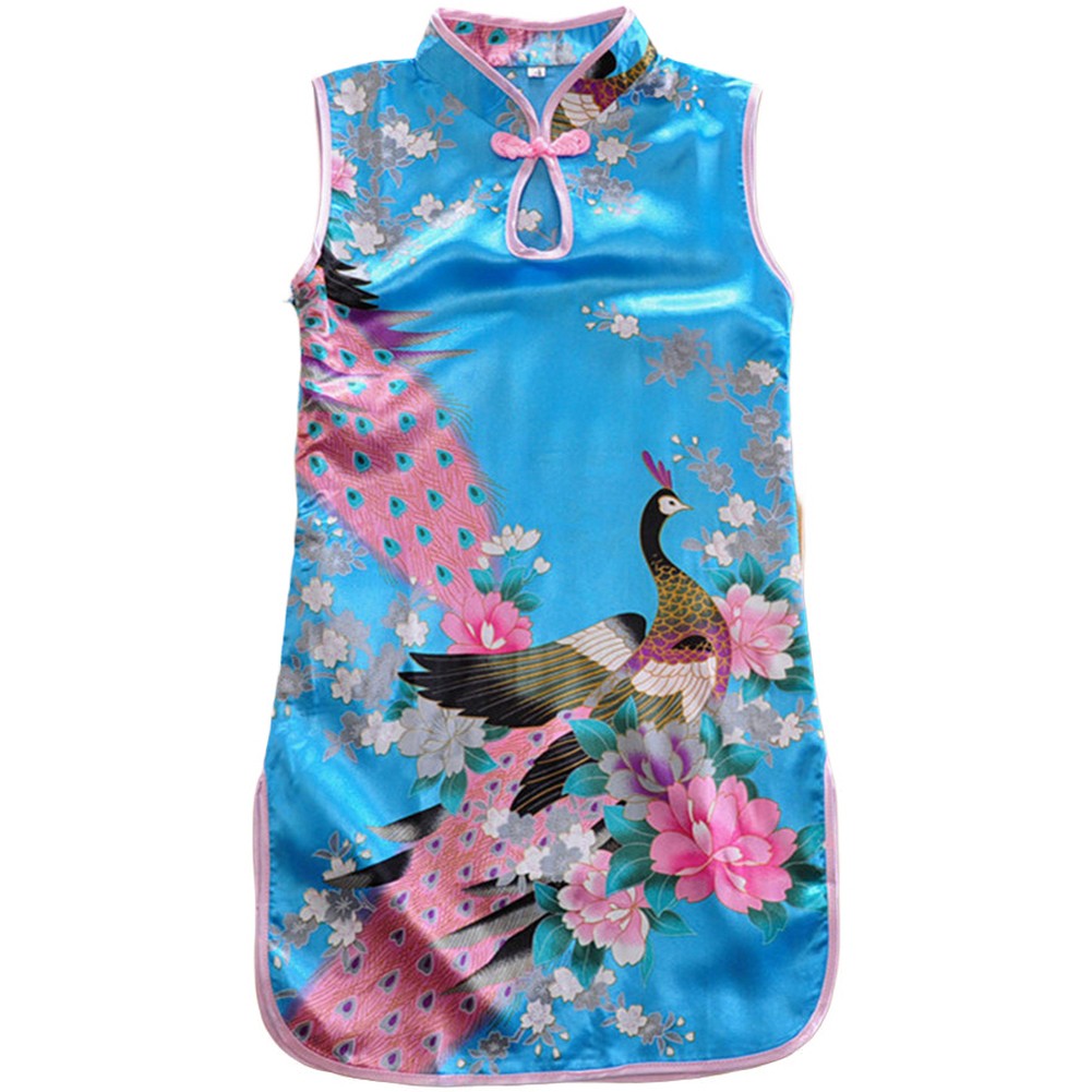 Child Girl Cheongsam Dress Slim Fit Peacock Floral Printed Traditional Qipao