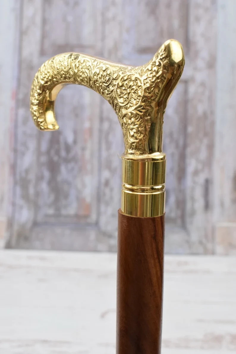 Classic Walking Stick Wooden Brass Elegant Golden Cane Gift for GrandfatherMen