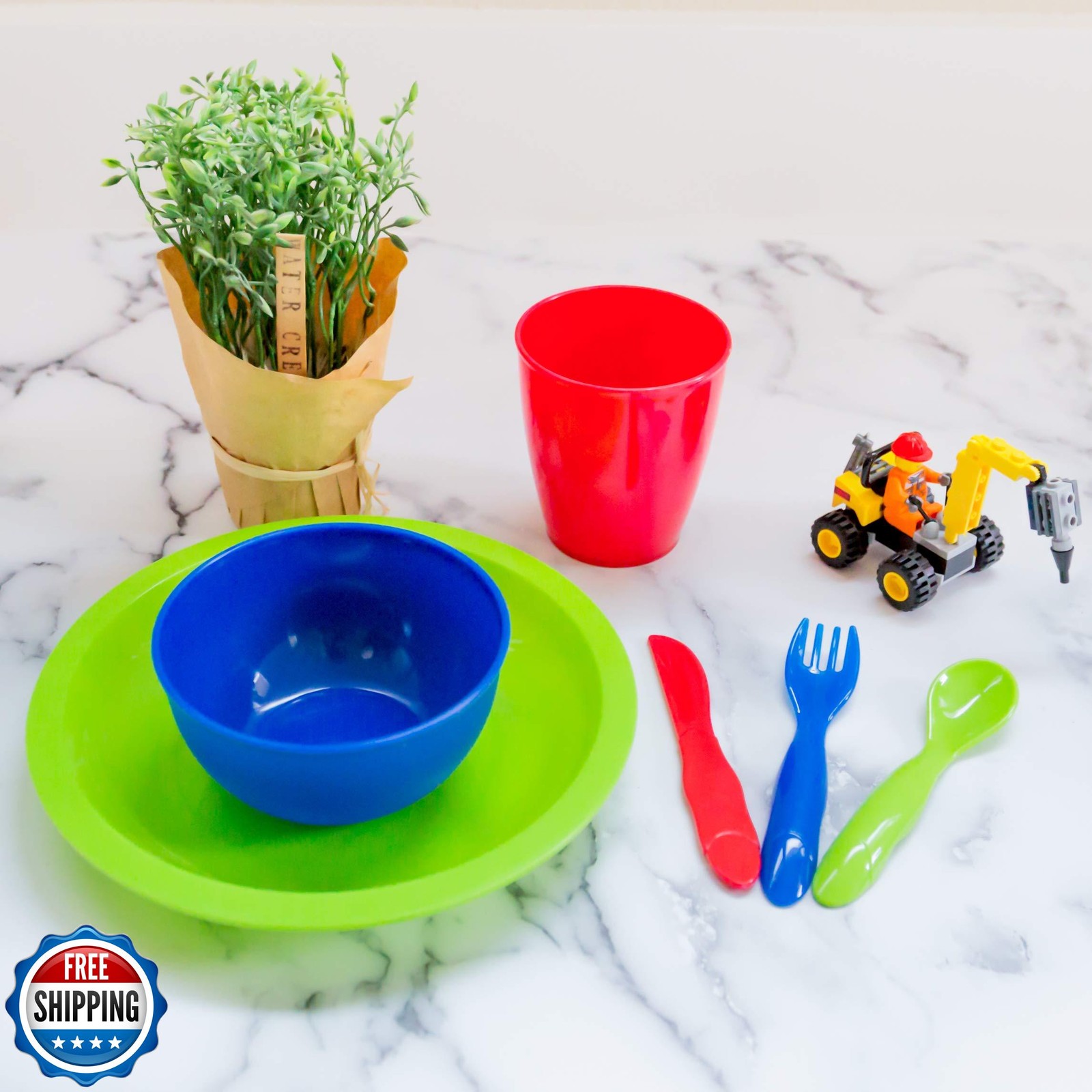 как выглядит Youngever 54 Pcs Plastic Kids Dinnerware Set of 9 in Assorted Colors, Toddler фото