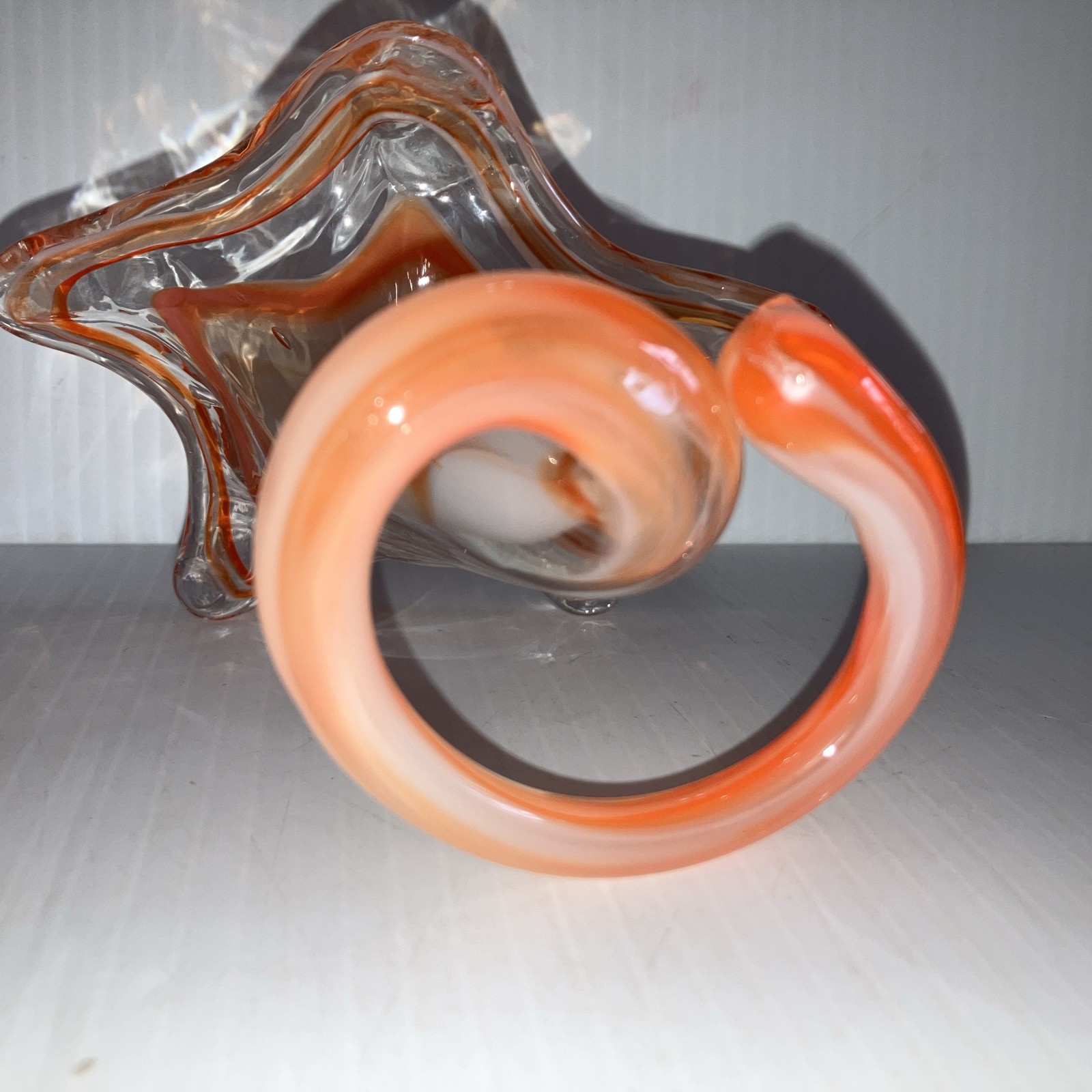 как выглядит Murano Style Vase hand-blown art glass Ruffled Edge Orange Clear Swirl/218g фото