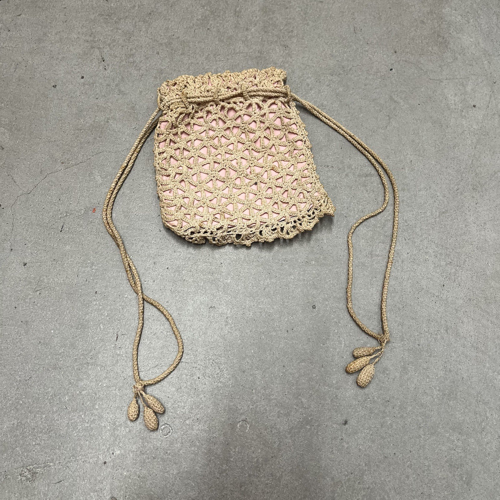 Antique Lace Crochet Drawstring Cinch Bag Purse Pink Lining