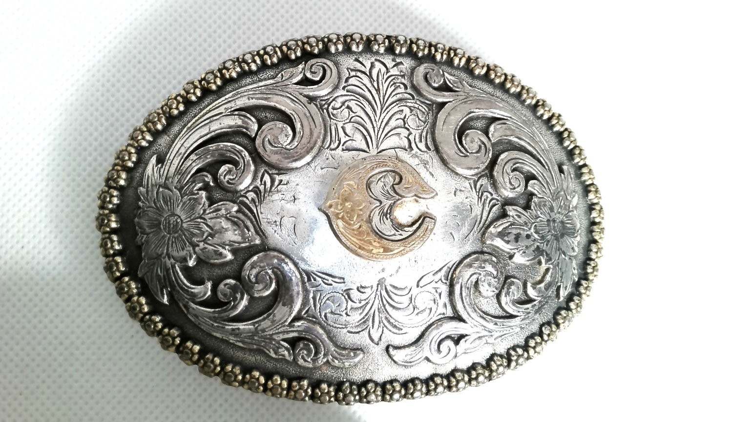 как выглядит Nocona Western Belt Buckle Silver Gold Floral Oval Letter C фото