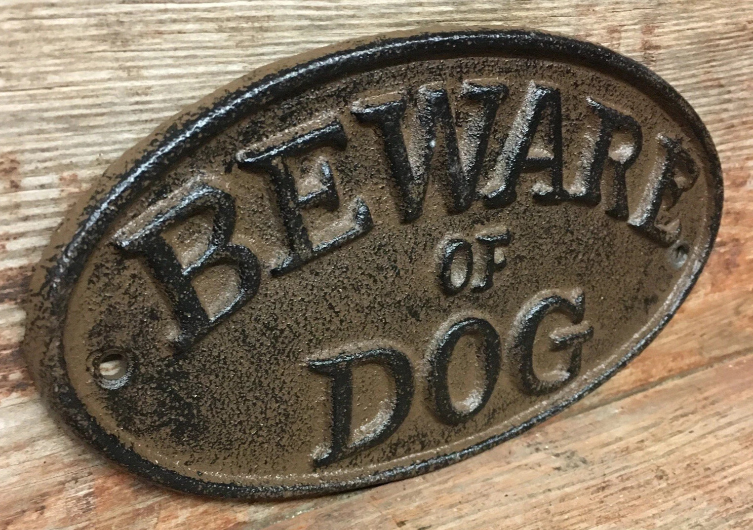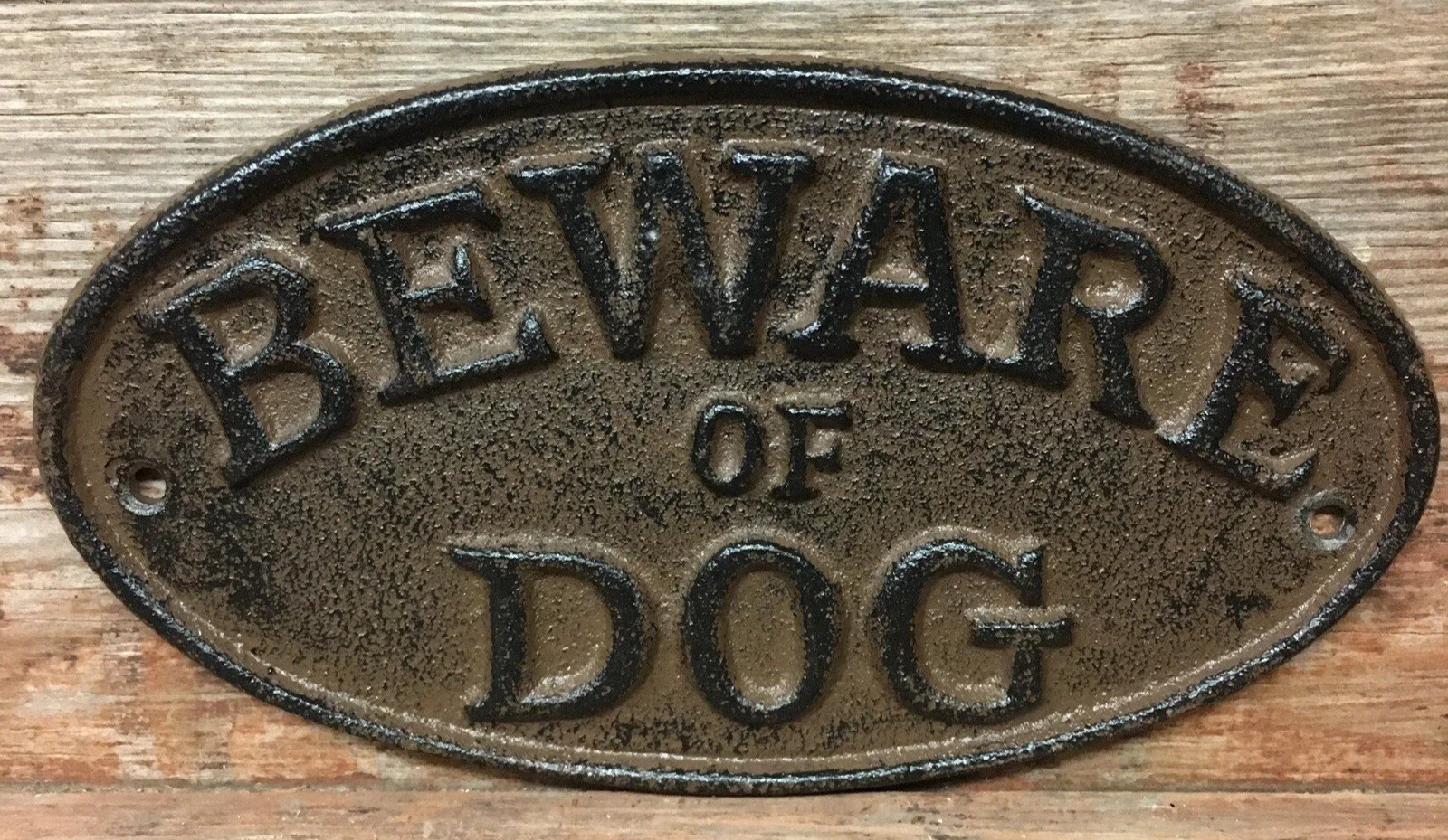 как выглядит Oval Cast Iron "BEWARE OF DOG" Metal Yard Fence Sign 7" x 3 " Heavy Rustic Vtg фото