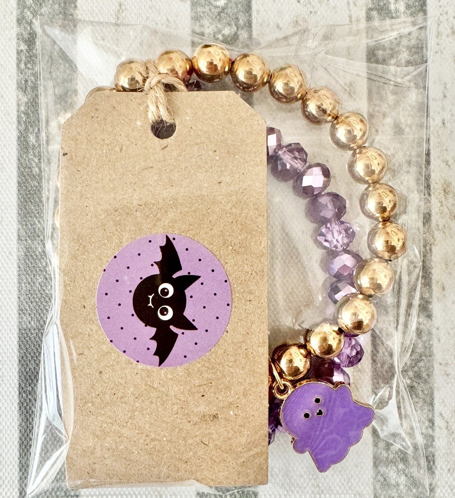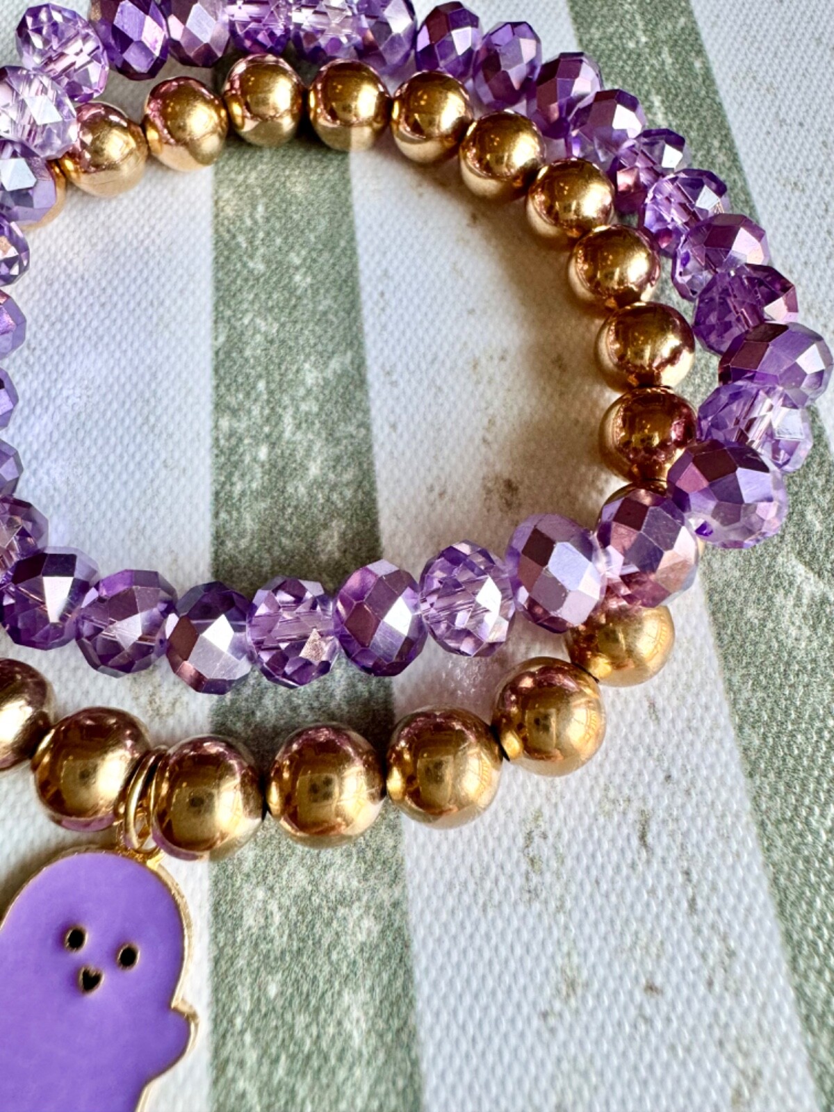 New Halloween Beaded Purple Gold Tone Adult Bracelet Set w/ Ghost Charm - 8