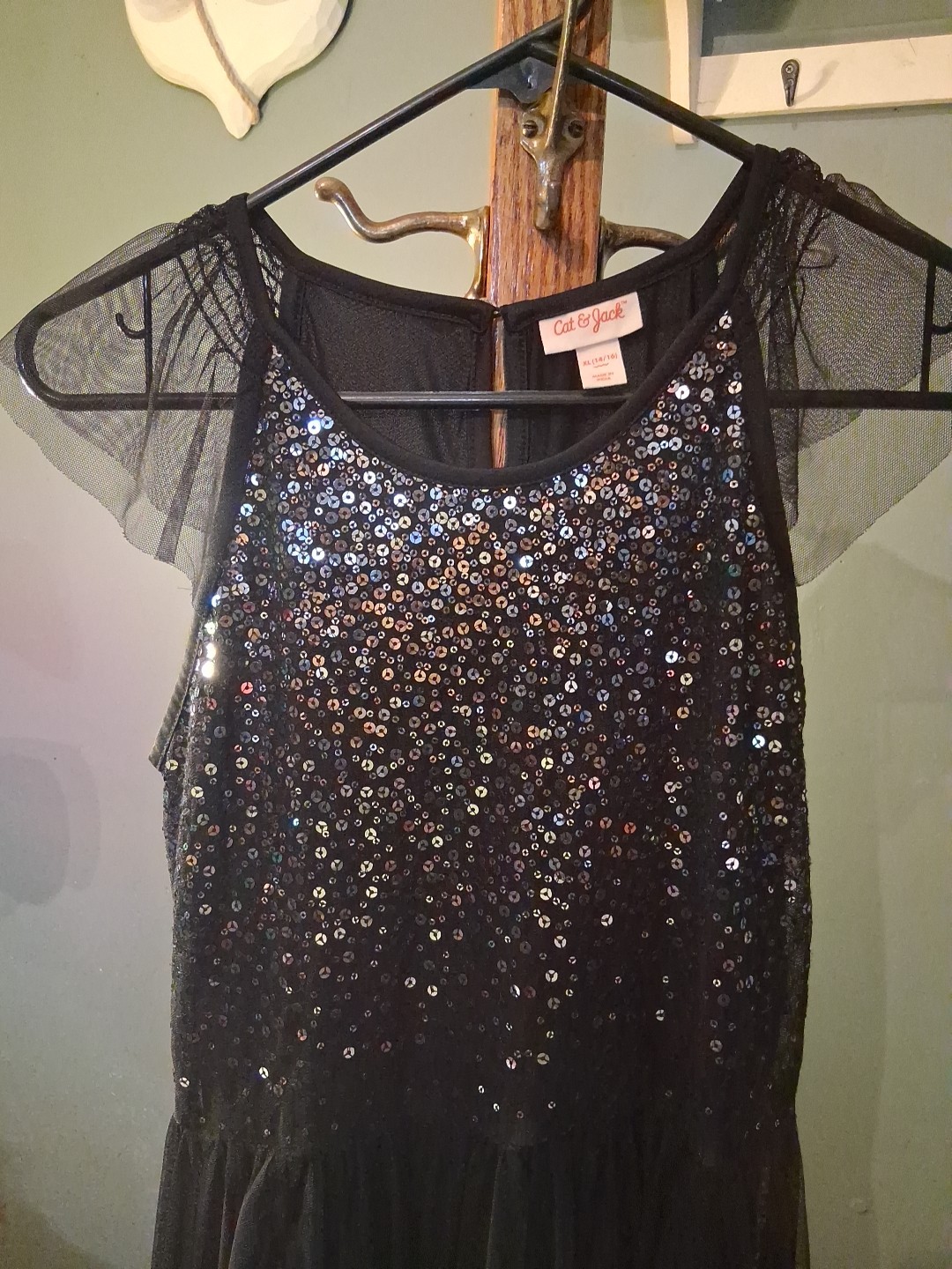 Girls Long Black Sequin Dress Netting cap net sleeves Cat Jack sz XL 14-16