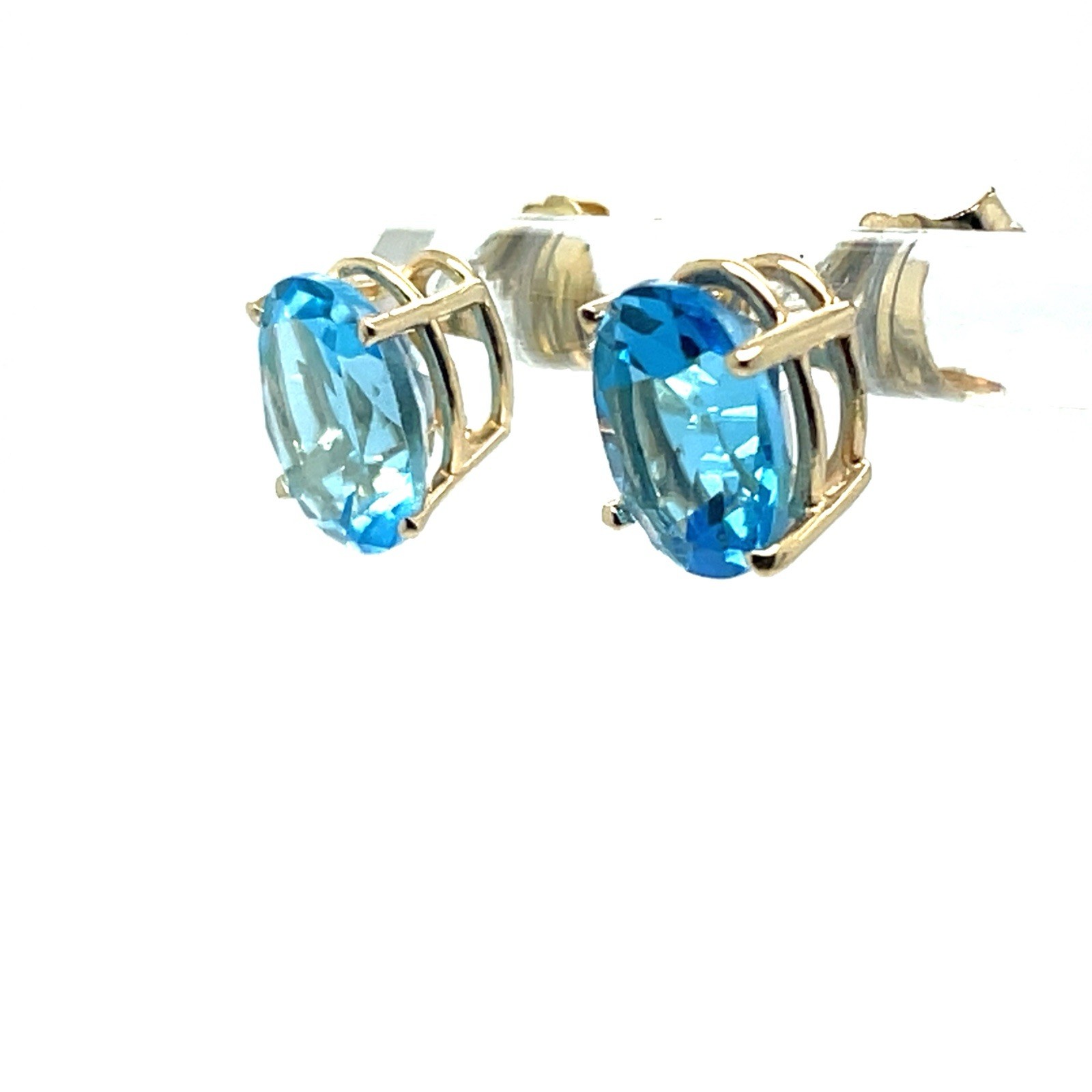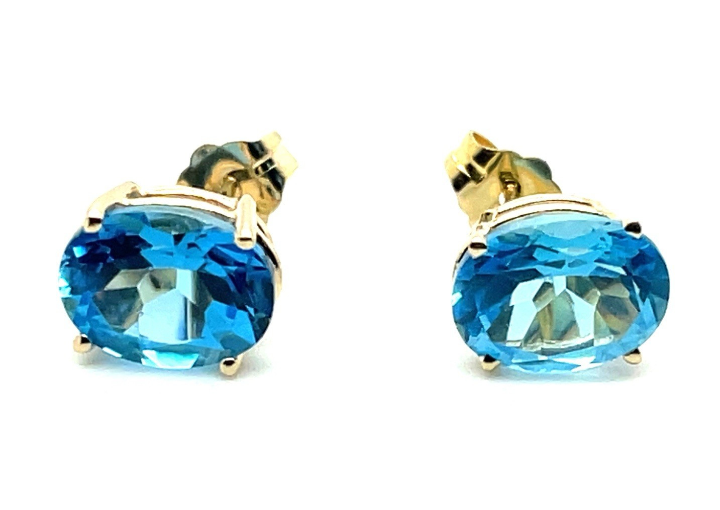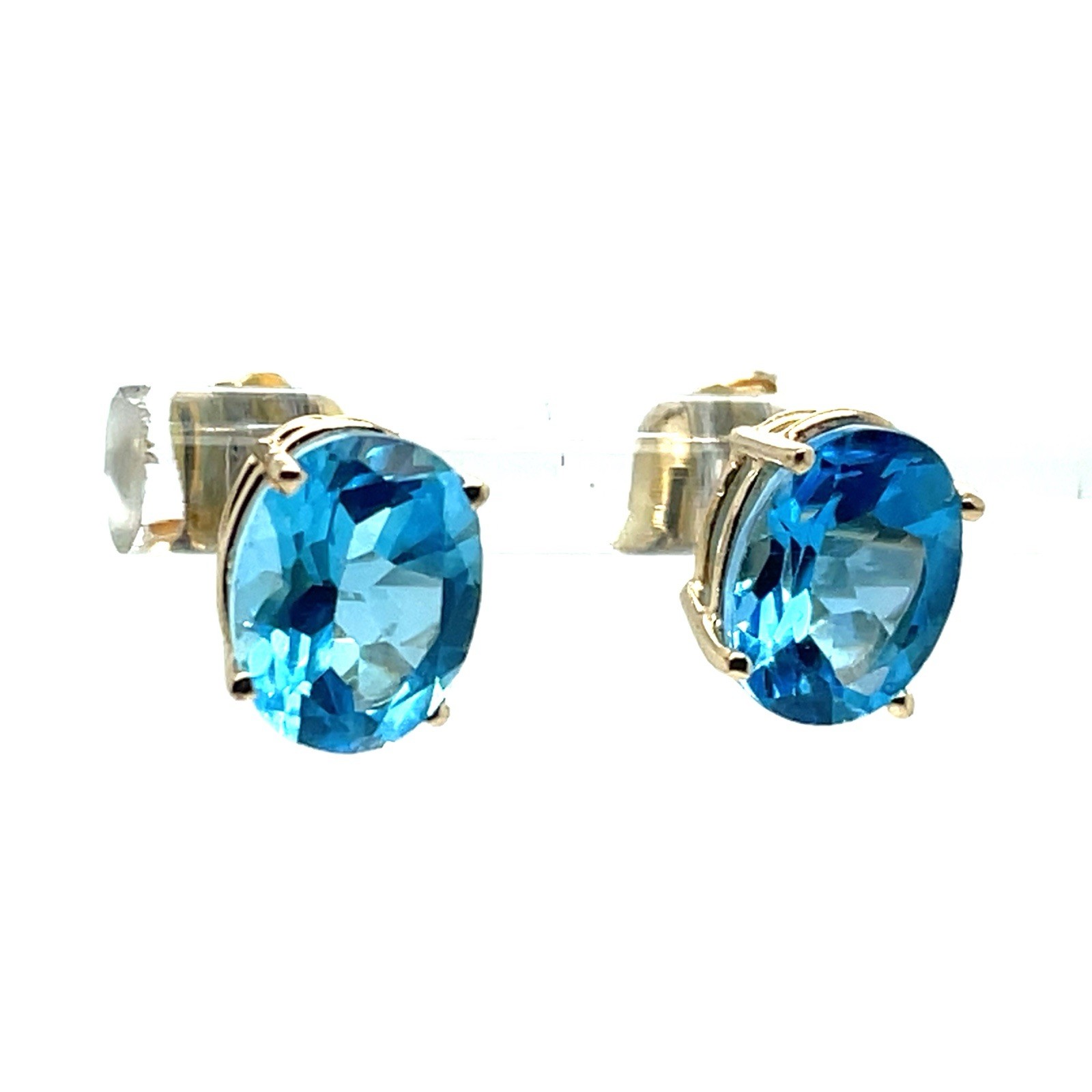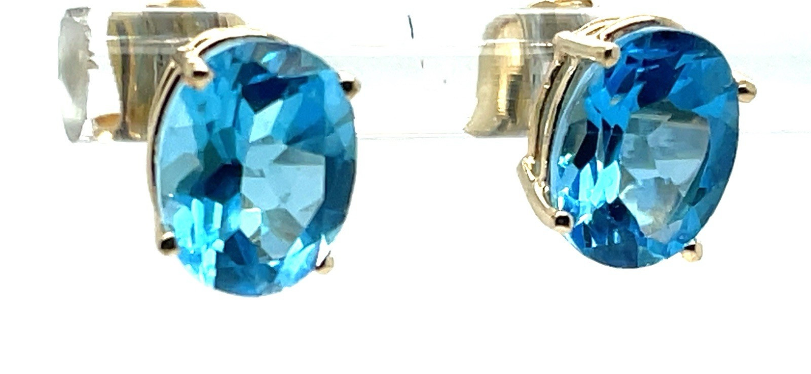 14K Yellow Gold 4.5 Ct Tw Oval 9x7mm Blue Topaz Gemstone Stud Earrings 2 Grams