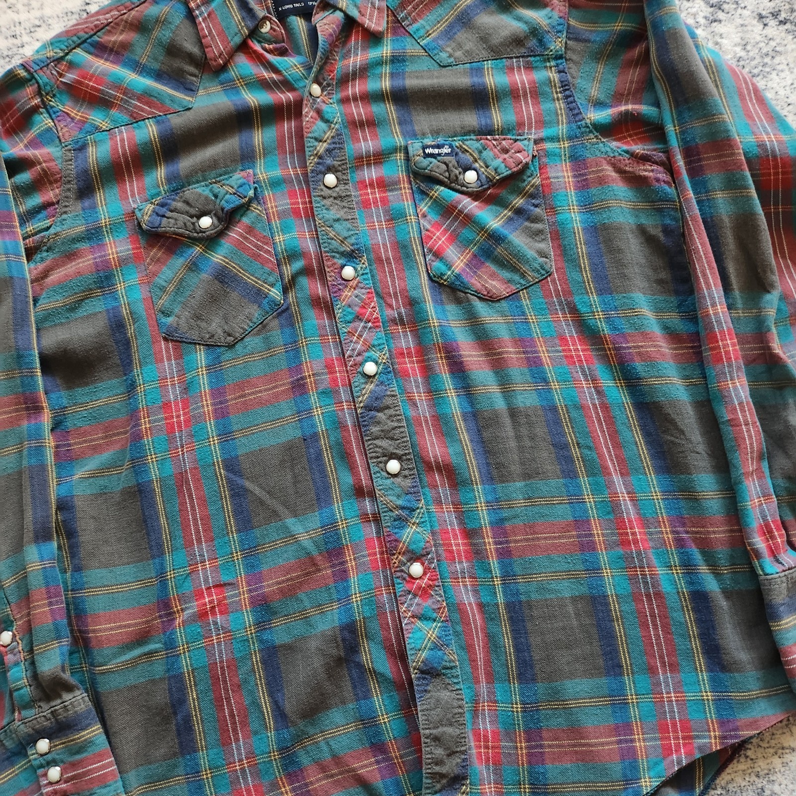 Vintage 90s Wrangler Pearl Snap Plaid Button Up Shirt Size XL long tail