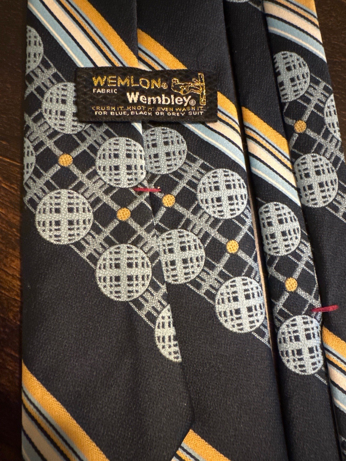 как выглядит Vintage 1970s Wembley Wemlon Tie  Geometric Mod Print Navy Blue Gold 3.5 Wide фото