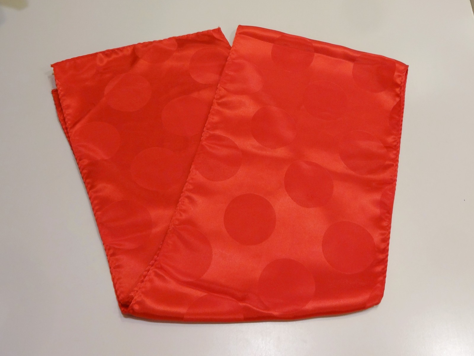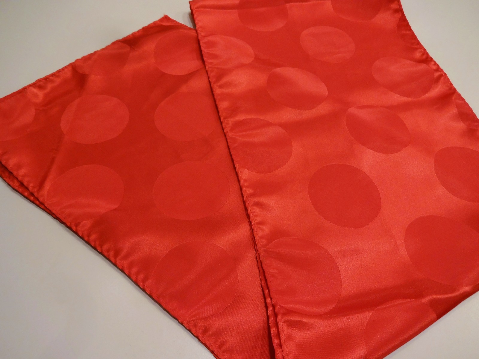 как выглядит Vtg RED CIRCLES SCARF 50 x 8 Satin Feel Polyester or Silk Big Polka Dots Shimmer фото