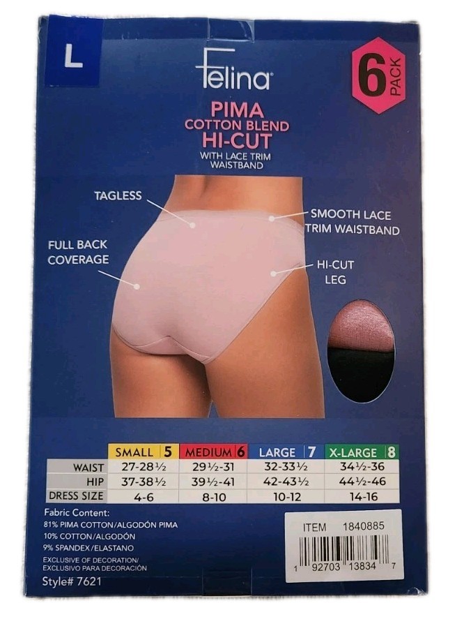 NIB Felina Pima Cotton Blend Hi-Cut Lace Trum 6 Pack Underwear Large