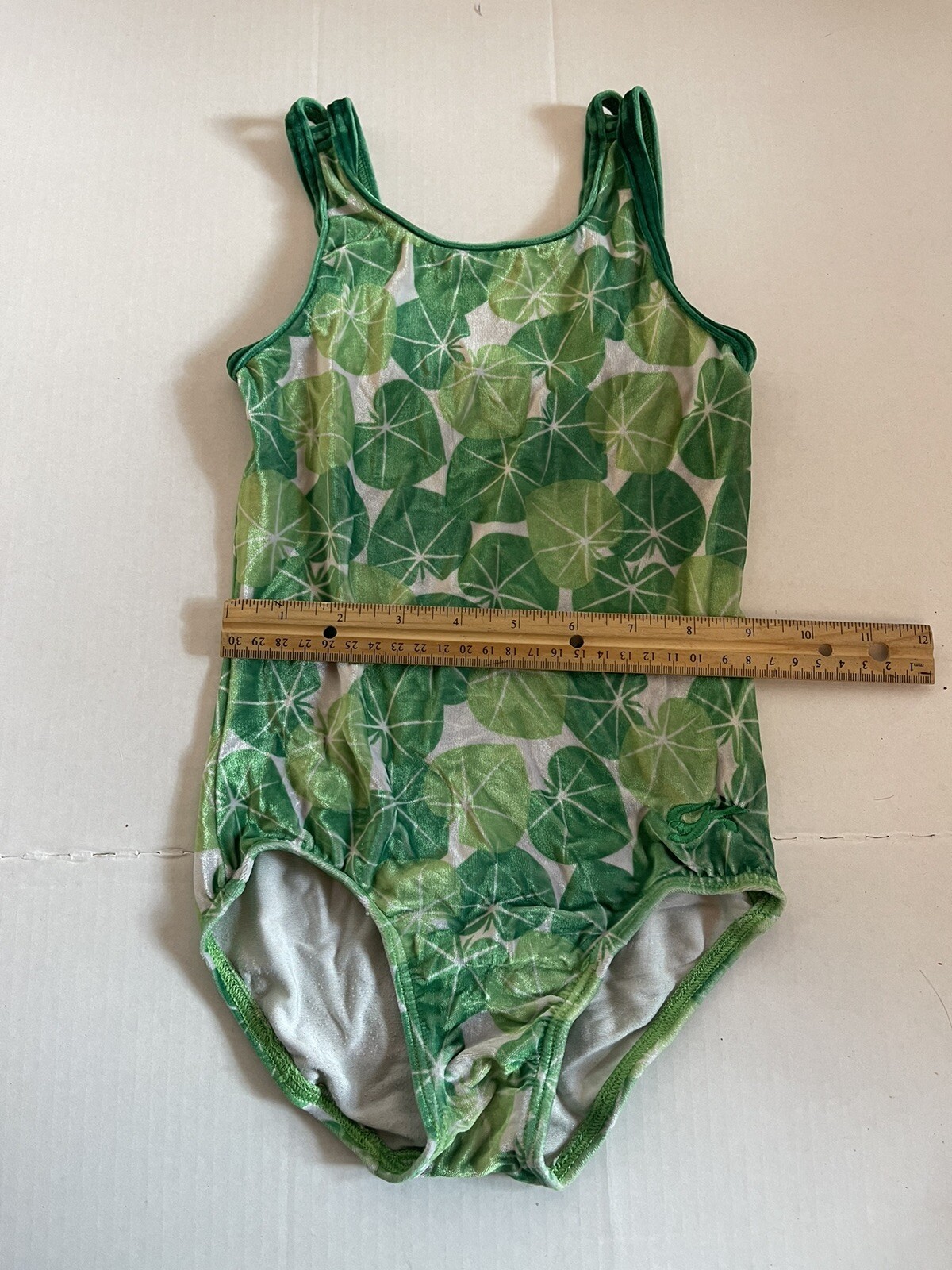 как выглядит GK Elite LEOTARD Gymnastics Green Leaf Velvet Texture фото