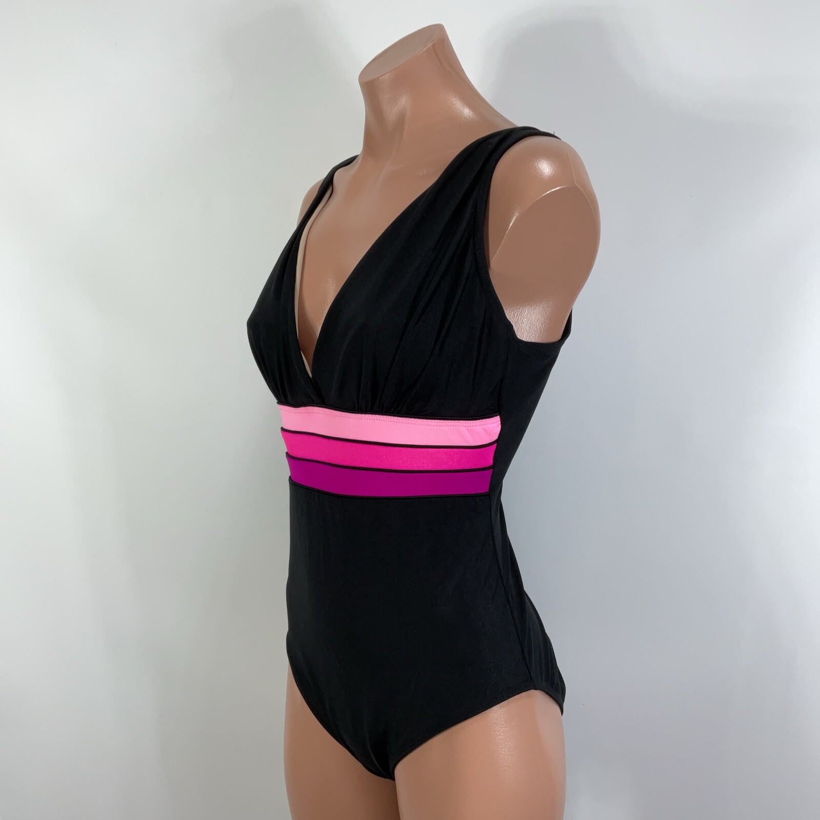 Longitude 10 Tank Swimsuit Pink Multicolor Black Striped Deep Plunge