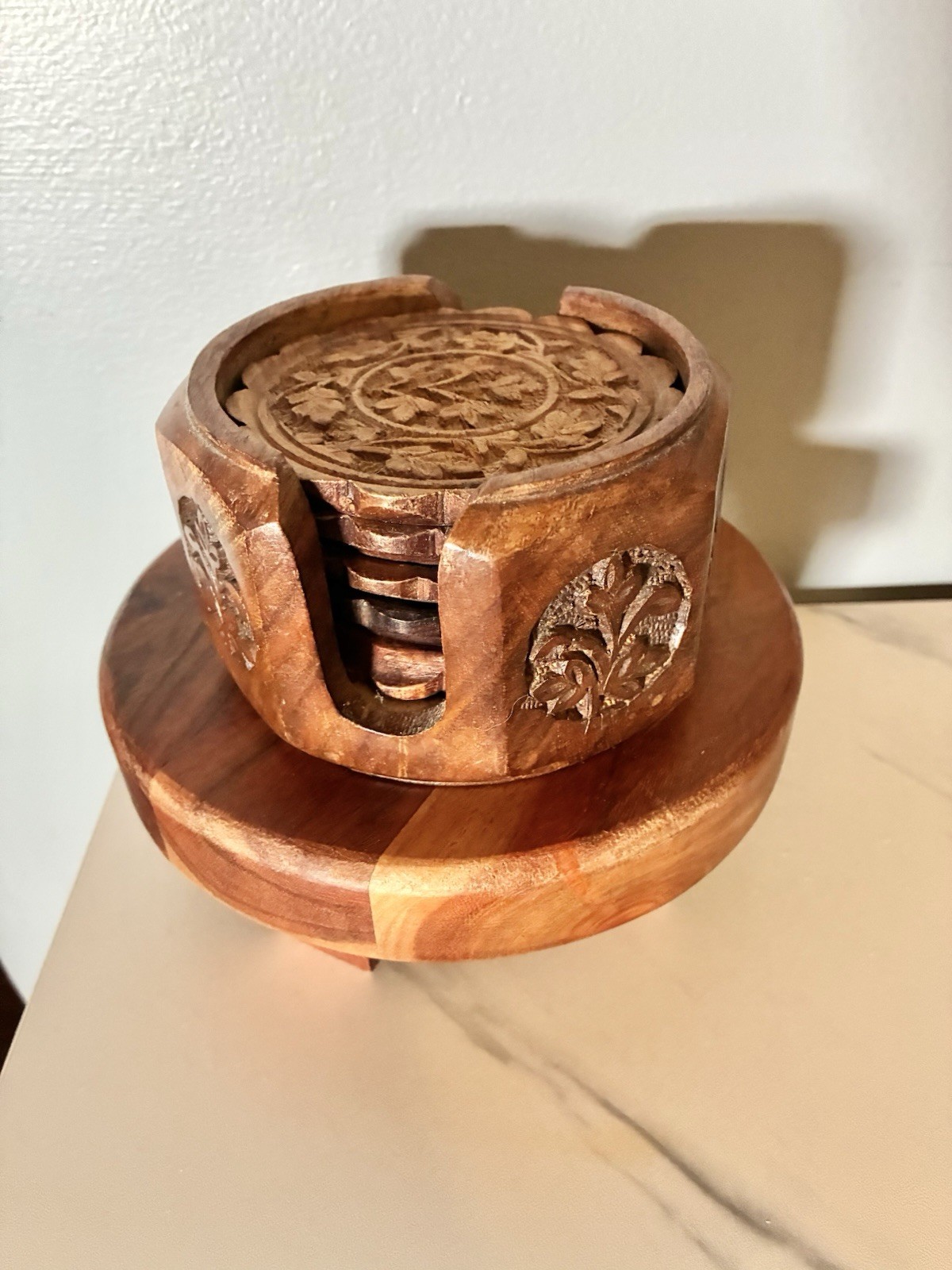 как выглядит Vintage Hand-Carved Wooden Coaster Set with Holder Made in India Floral Design фото
