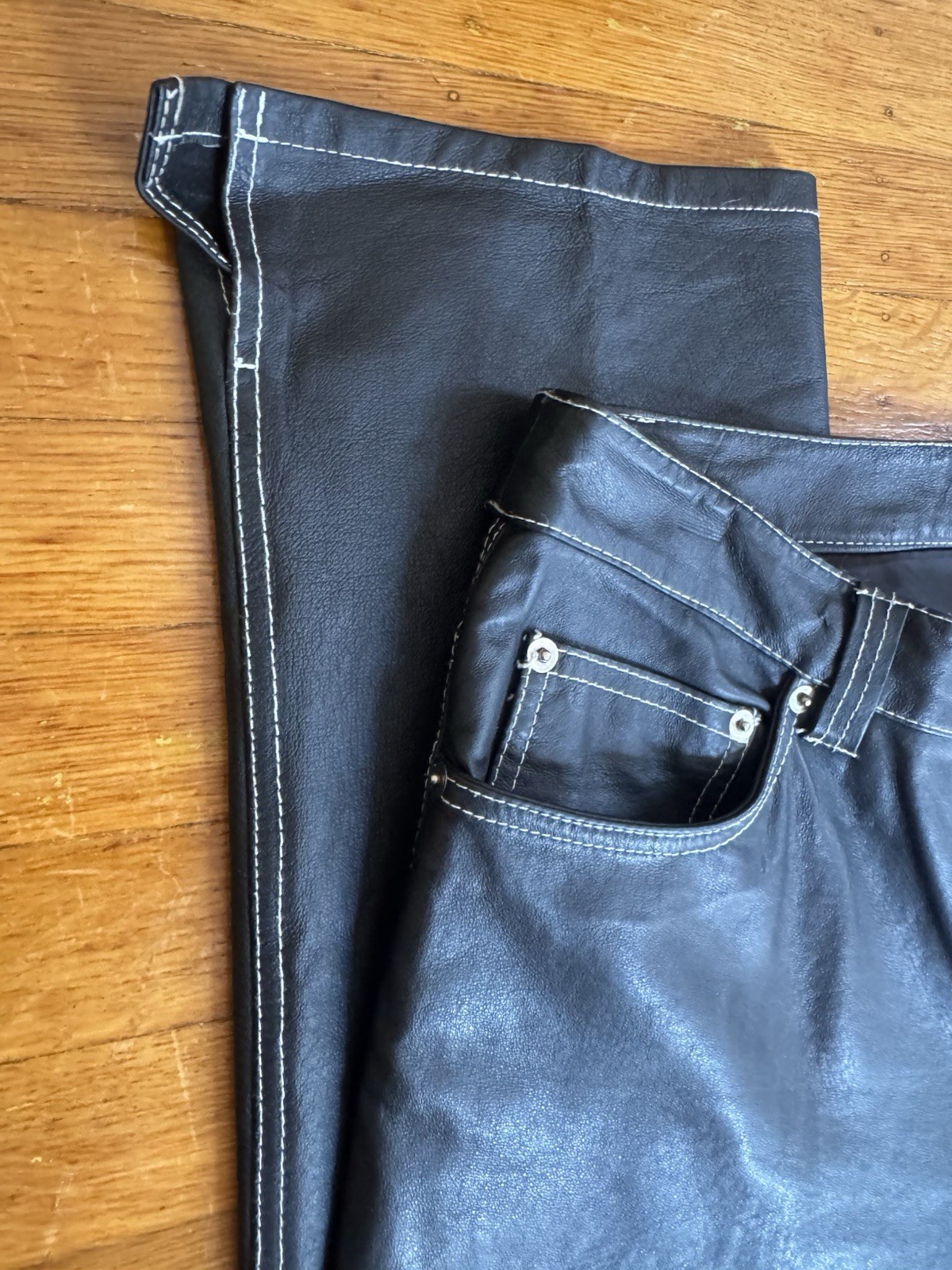 как выглядит Metrostyle Fully Lined Black Leather Pants White Stitching, Size 10/32x30, NOS фото