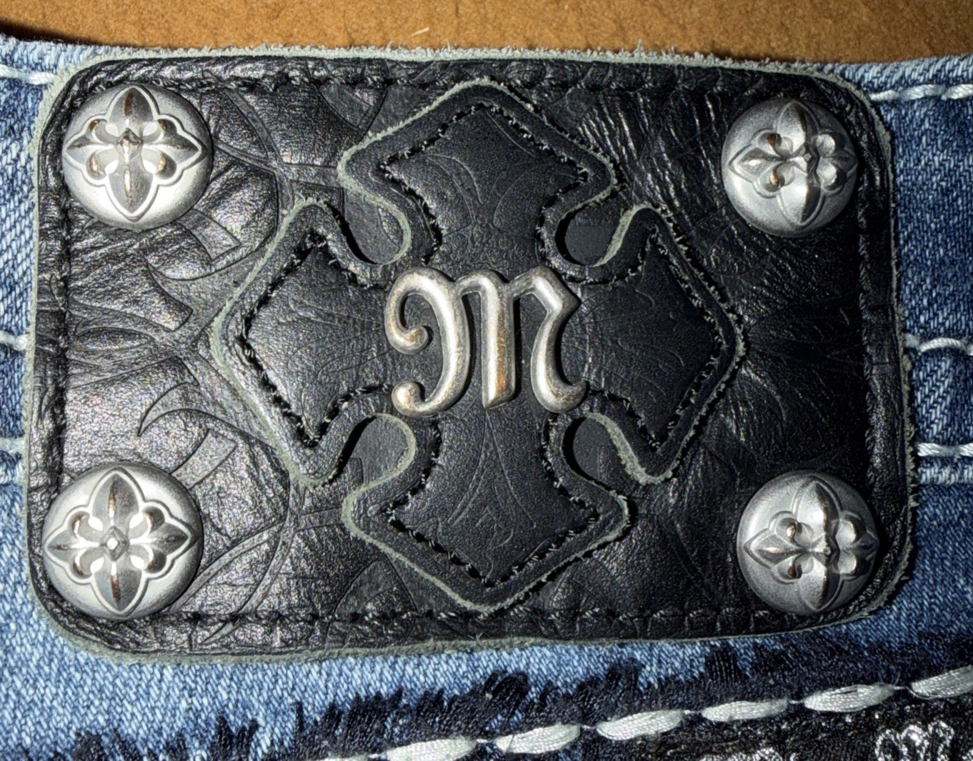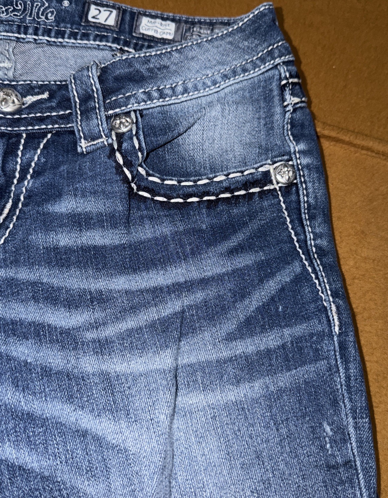 как выглядит Miss Me Med 226 Blue Jean Mid Rise Cuffed Capri s Peace Sign Bling MPt549P фото