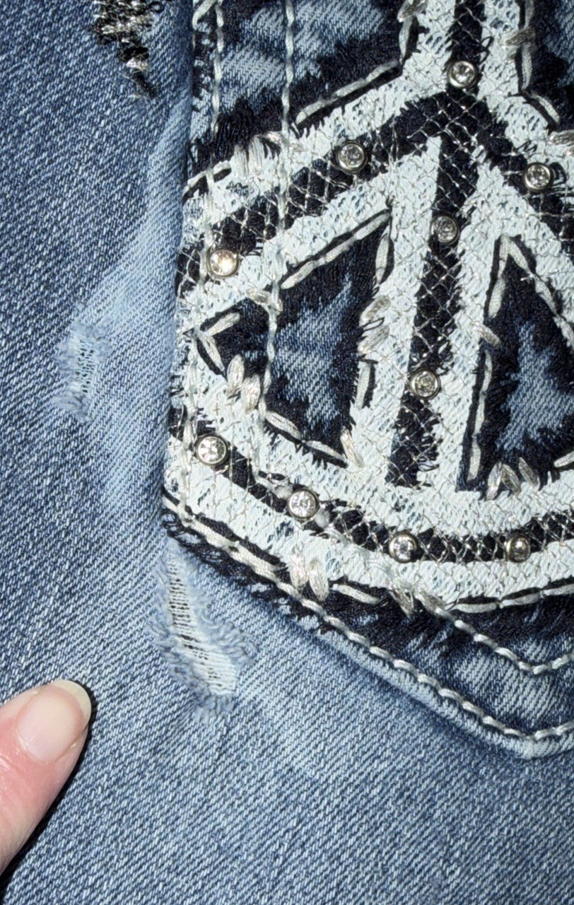 Miss Me Med 226 Blue Jean Mid Rise Cuffed Capri s Peace Sign Bling MPt549P