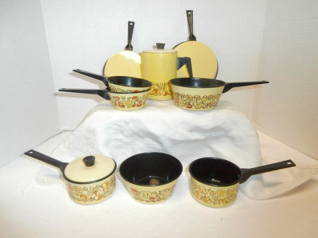 как выглядит 1970s VINTAGE MERRY MUSHROOM CHILDREN KITCHEN PLAY SET, METAL POTS PANS WOW фото