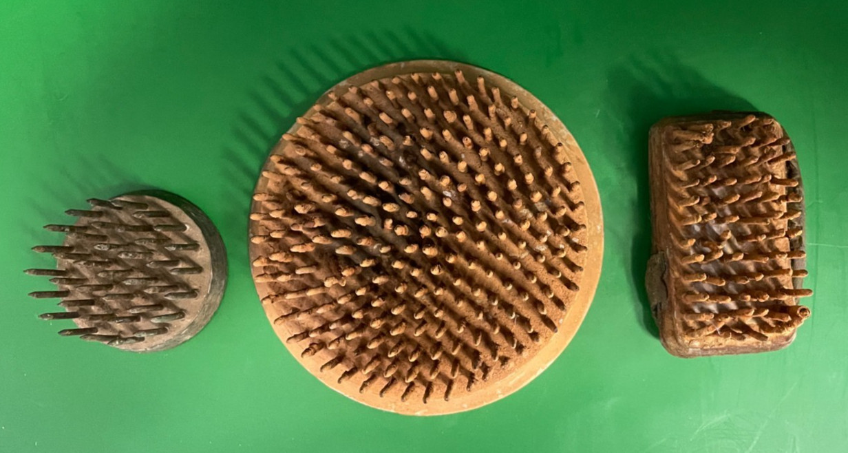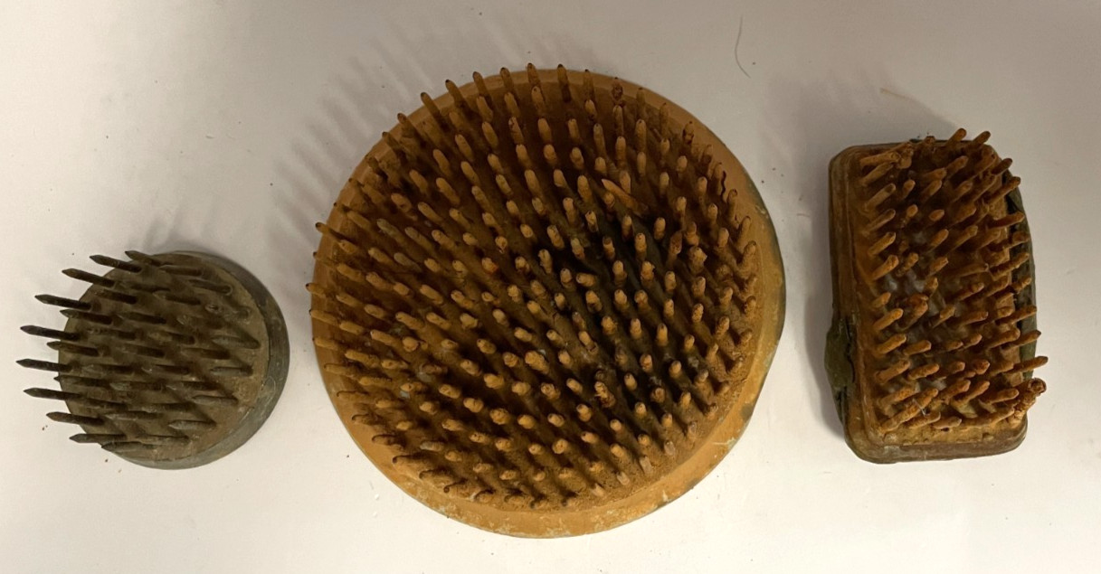3 Vtg Antique Metal Spiked Flower Frogs Floral Ikabana 3 , 1 1/4, 2x1 1/4
