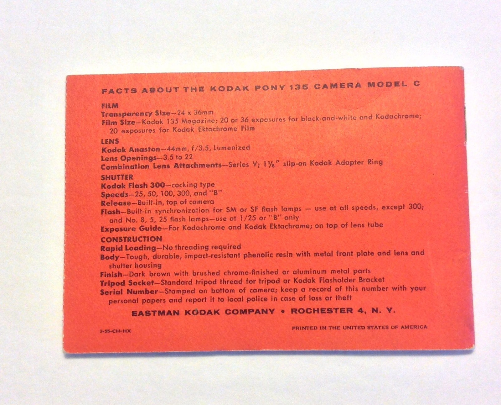 1955 Model C KODAK PONY 135 CAMERA OPERATING INSTRUCTIONS
