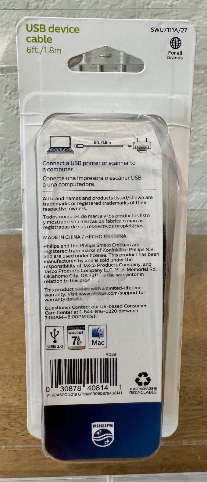 Philips Printer Cord USB-A/USB-B Device Cable 6ft Connects Printer to Computer