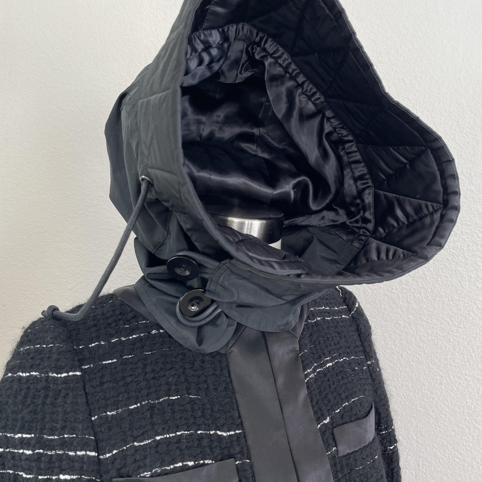 как выглядит Sacai Coat Womens Small Black Wool Nylon Mixed Media Hooded Avant Garde Jacket фото