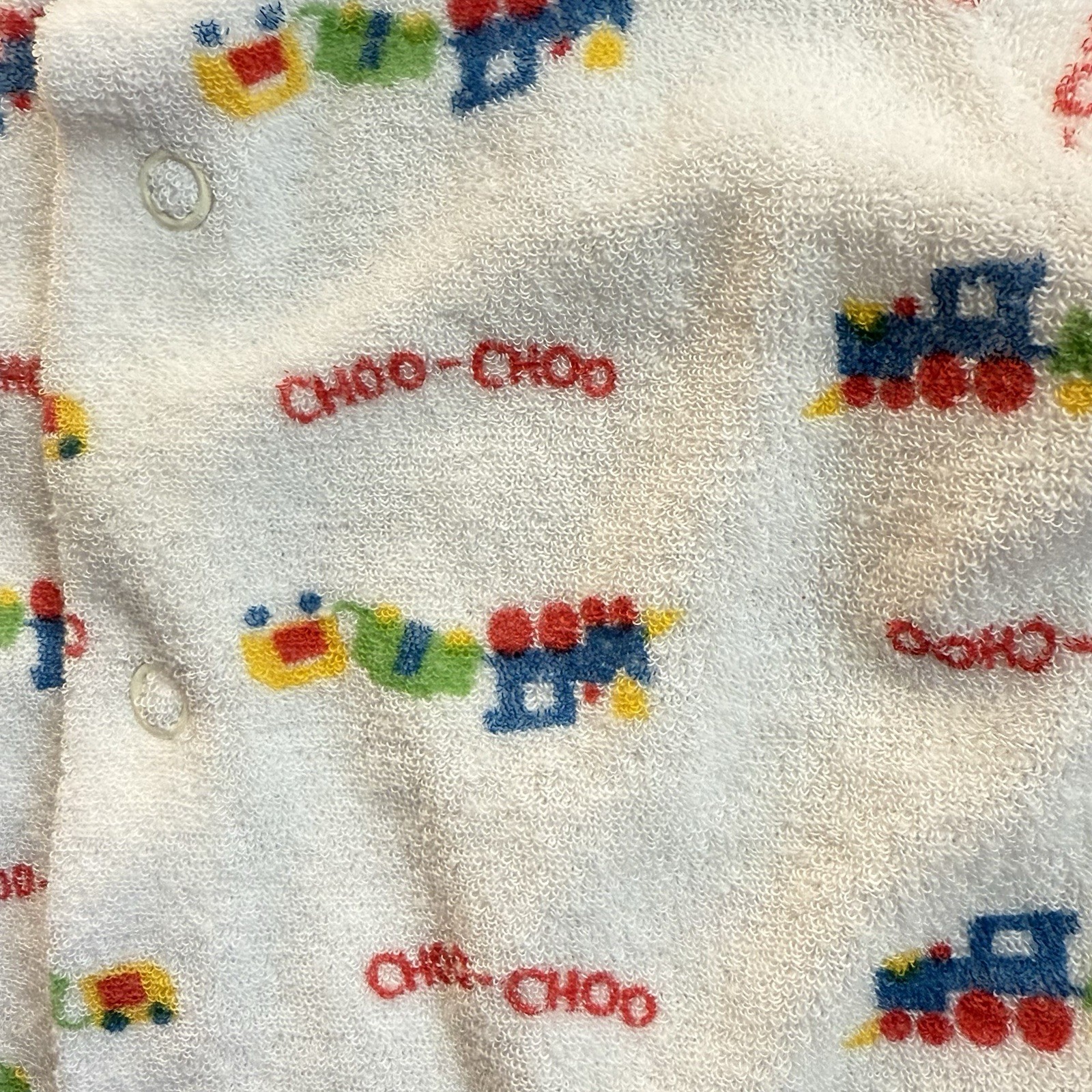 vintage Carter's terry cloth baby sleeper with a colorful train pattern