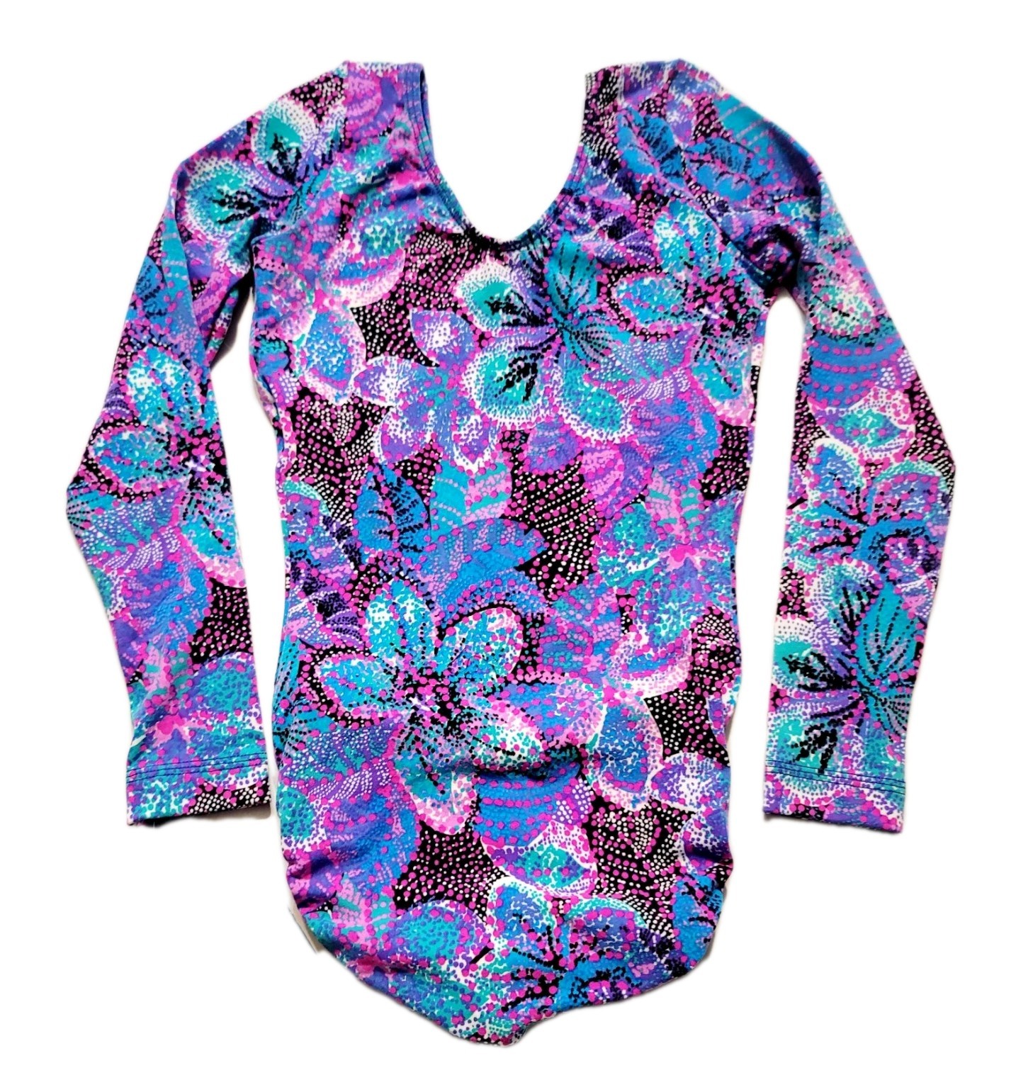 GK Elite VTG Vibrant Blue Pink Botanical Cotton LS Leotard Bodysuit AS Adult S