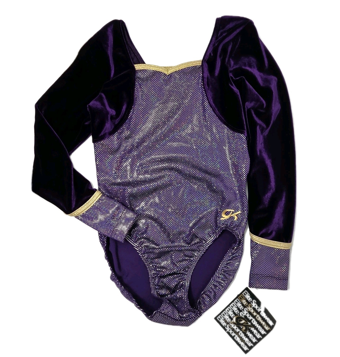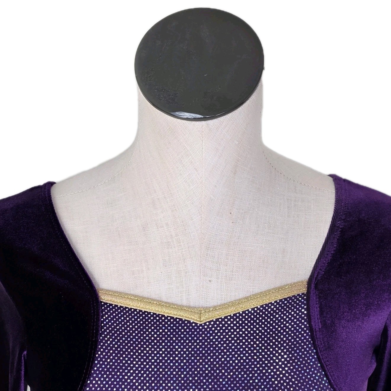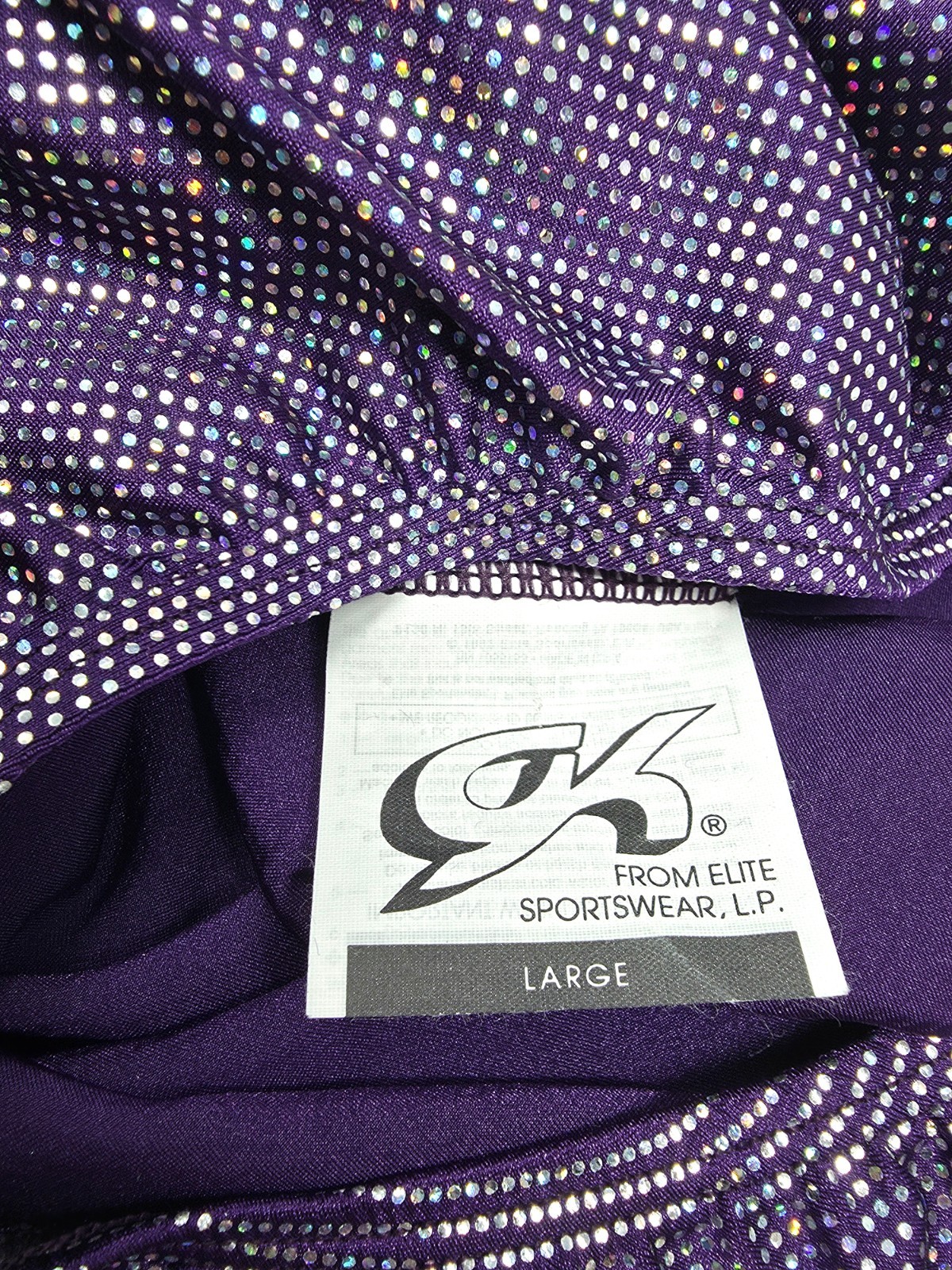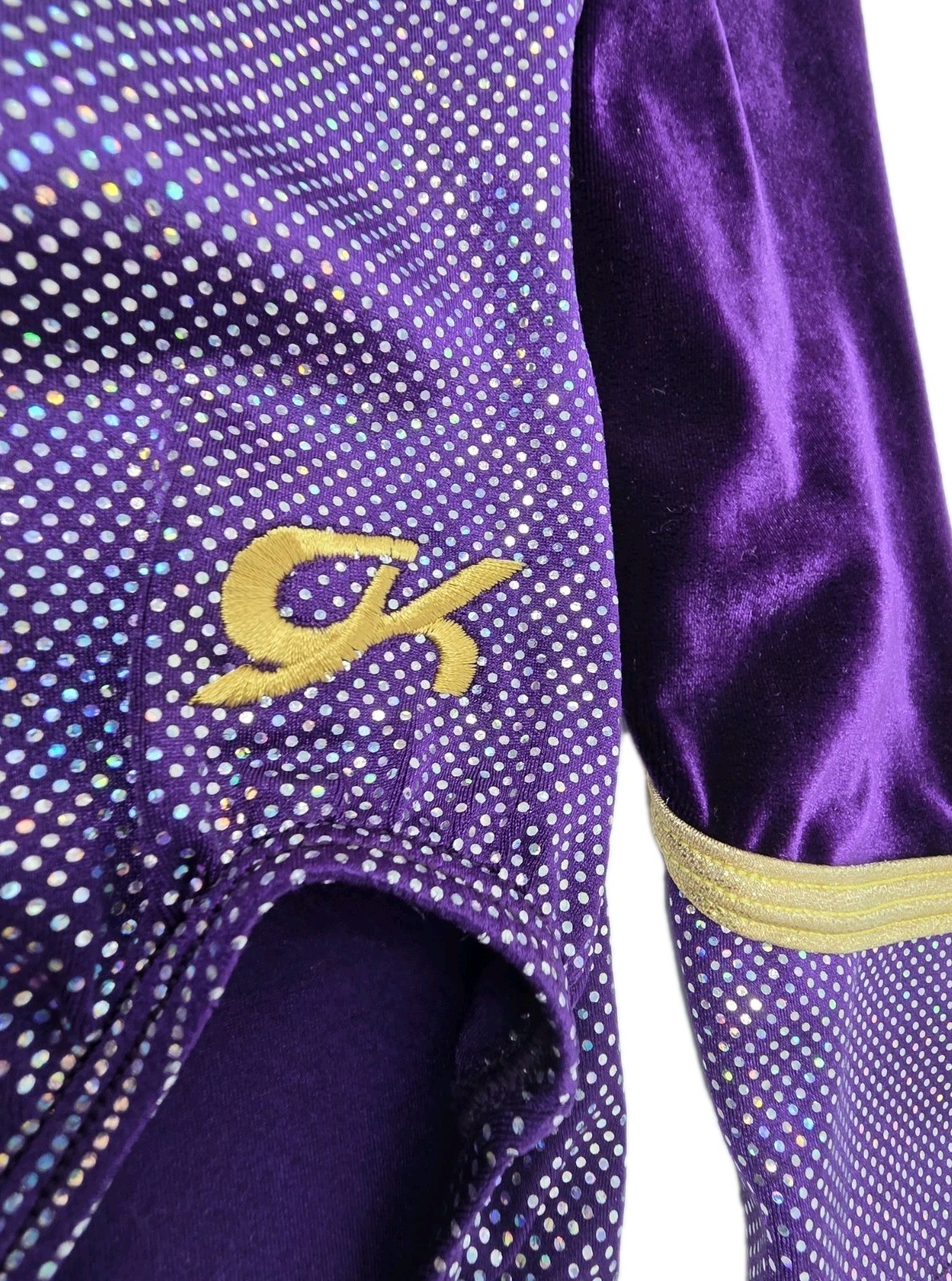 GK Elite VTG Pixelated Royalty LS Velvet Sleeves Leotard Purple Gold AL Adult L