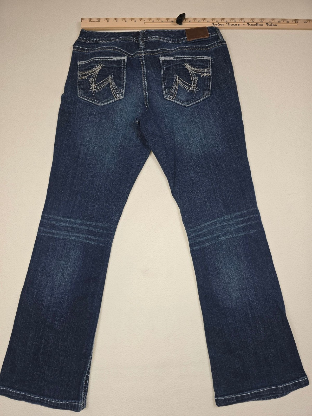 как выглядит Maurices 7/8 Short Original Bootcut Jeans Blue Blend Mid-Rise Distressed Stretch фото