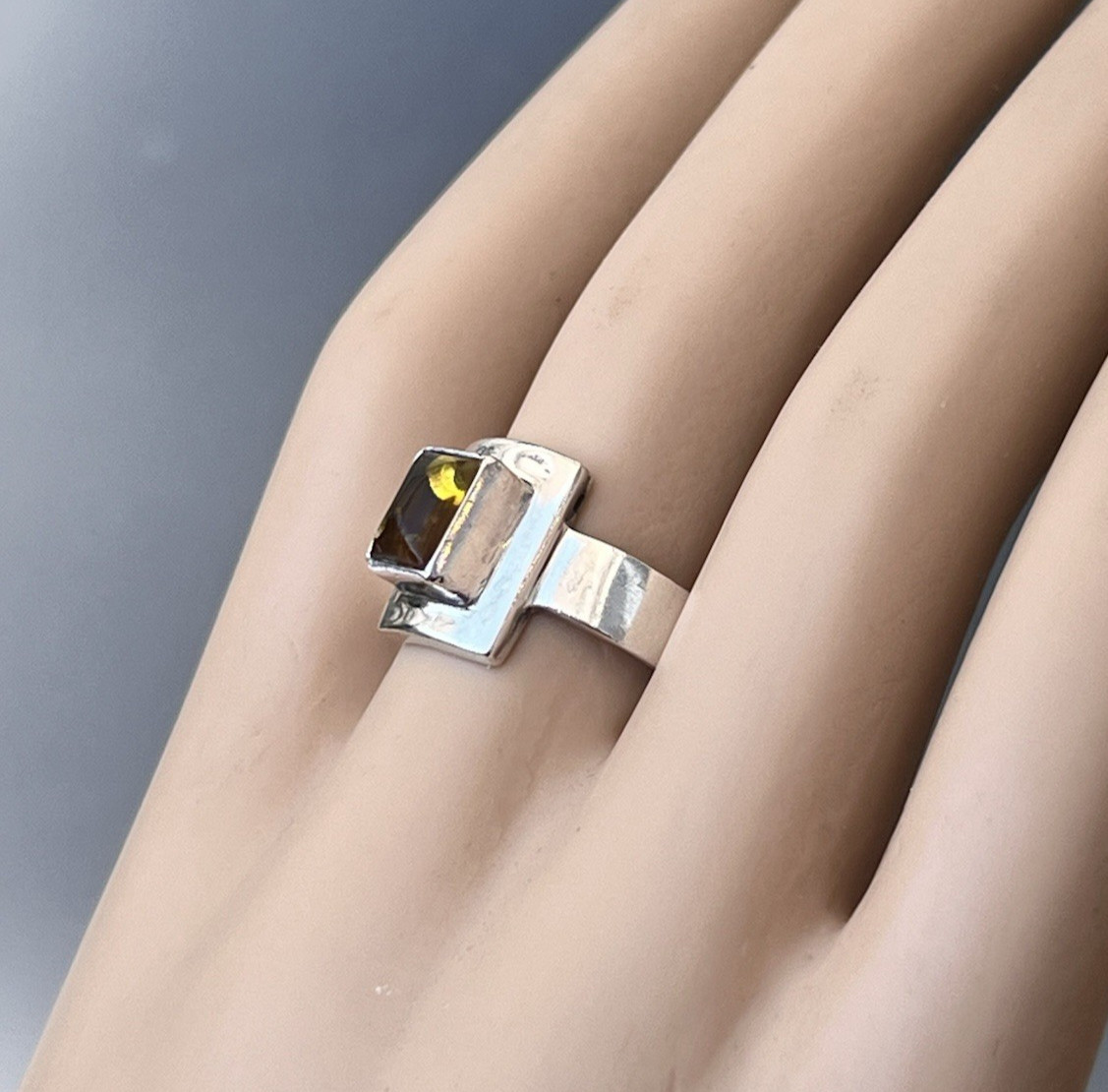 как выглядит Vtg Sterling Amber Ring, Modernist Rectangular Setting, 6 grams, Size 8.75 фото