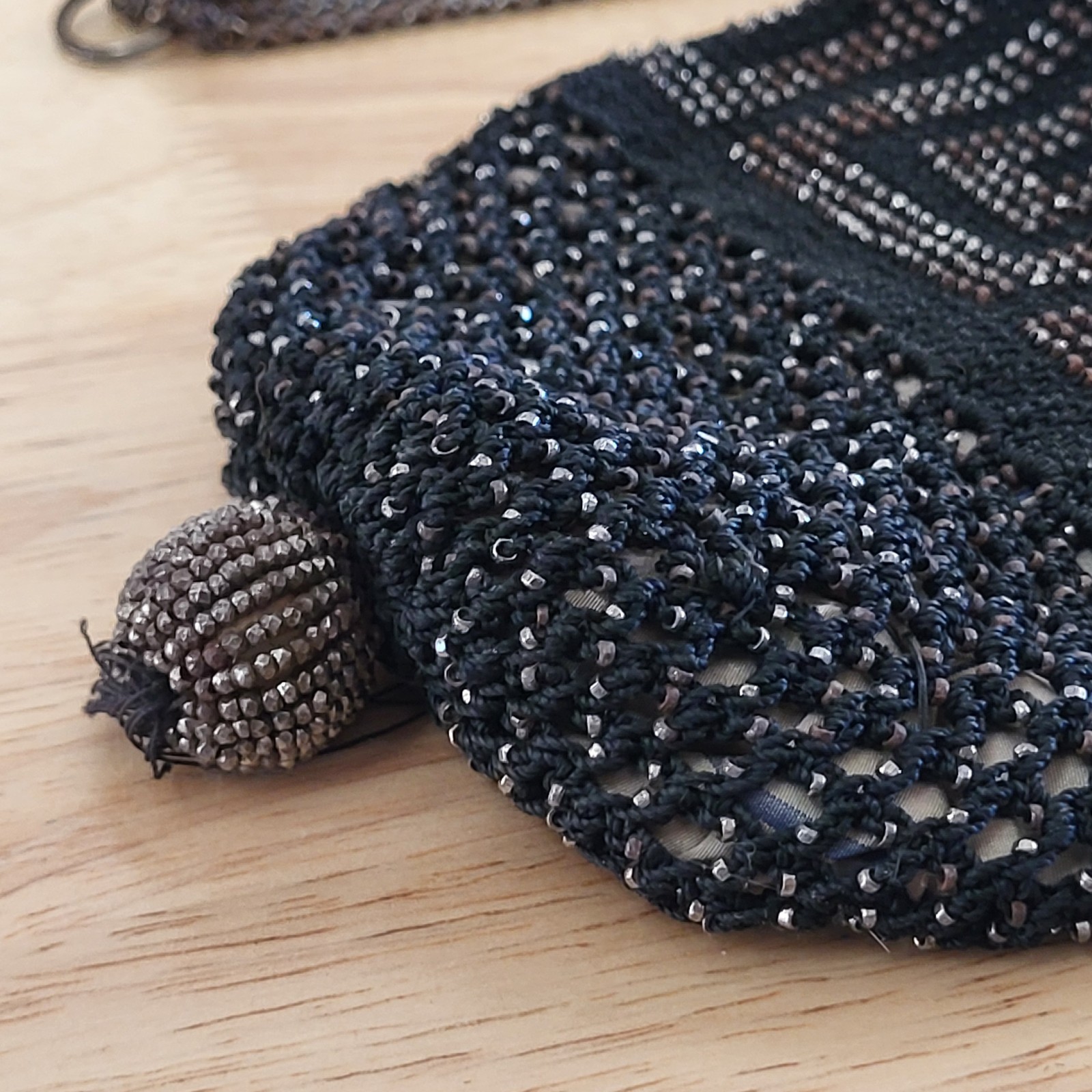 Victorian Style Antique Black Crochet Cut Steel Bead Fringe Purse Handbag France